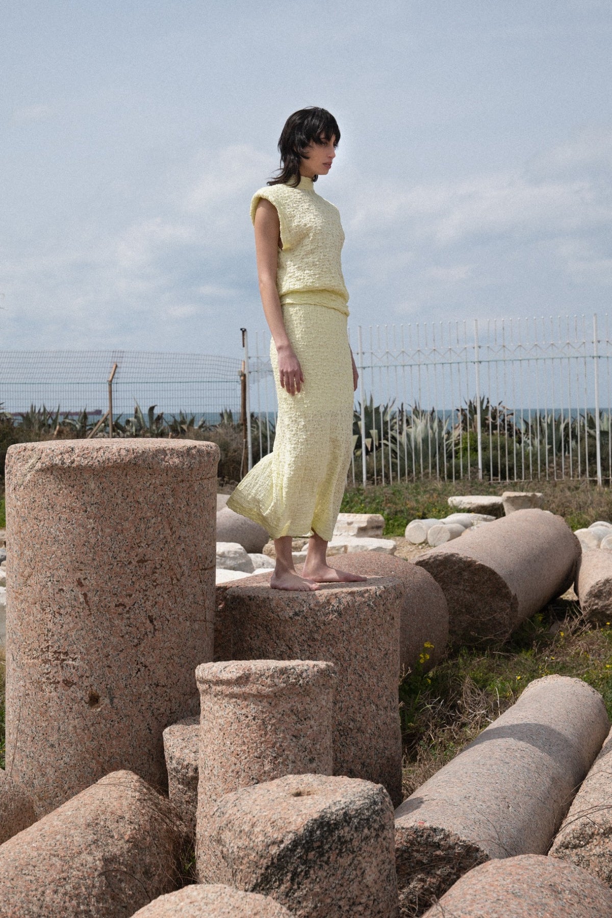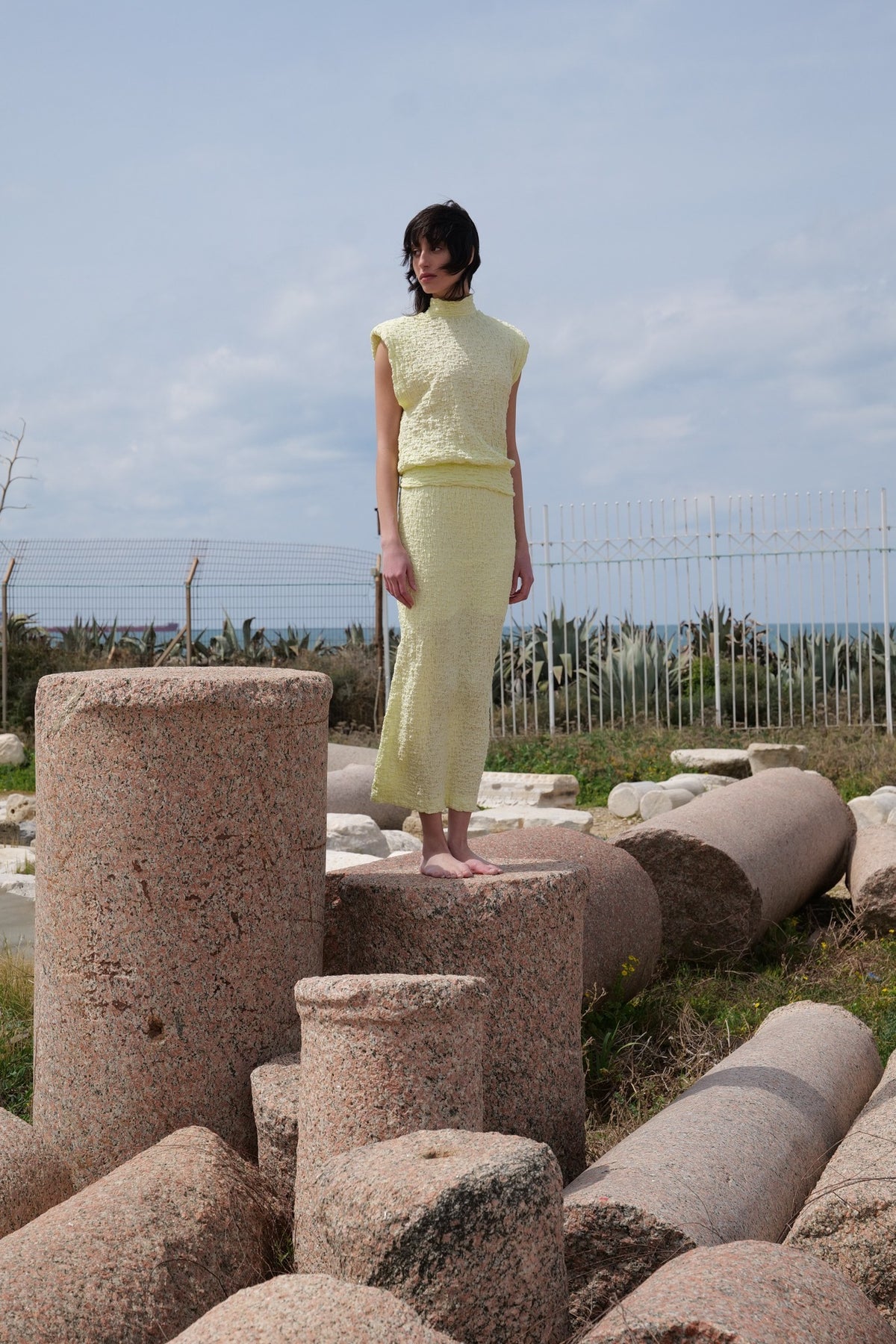 Crinkled knit high neck sleeveless top with shoulder pads and back invisible zipper.