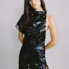 Pleated knit with foil mini dress with wrap gathered detail on the front. Side draped detail, and invisible zipper at the back.