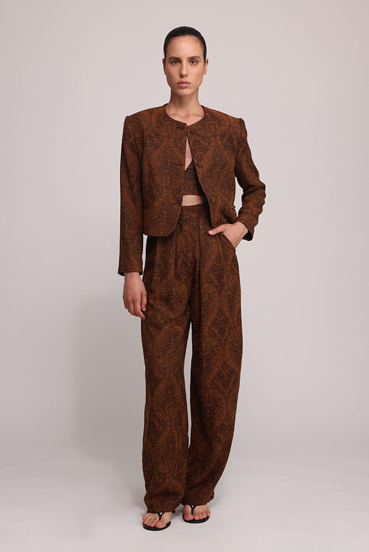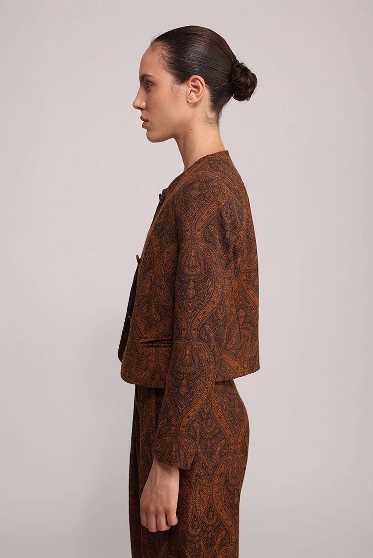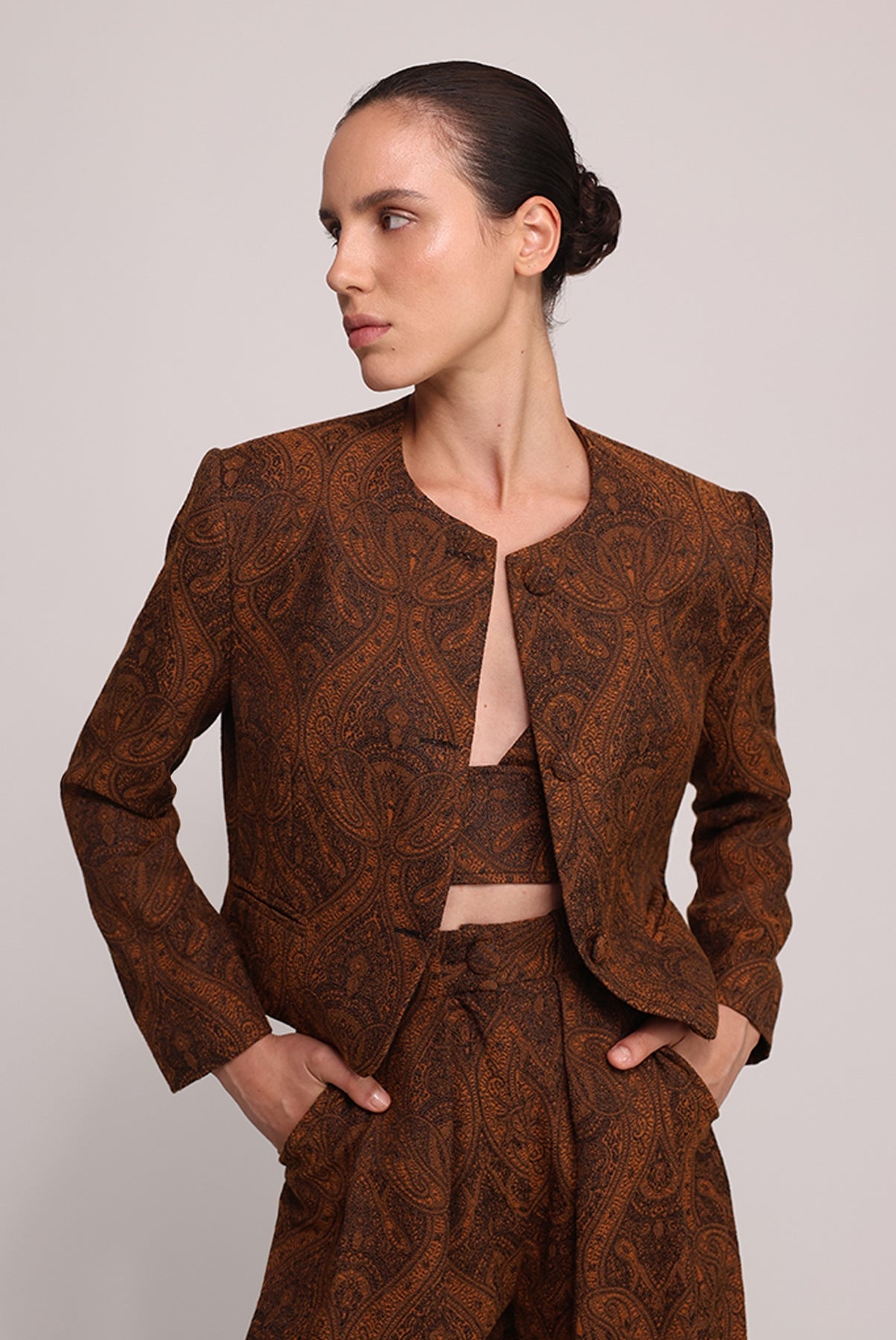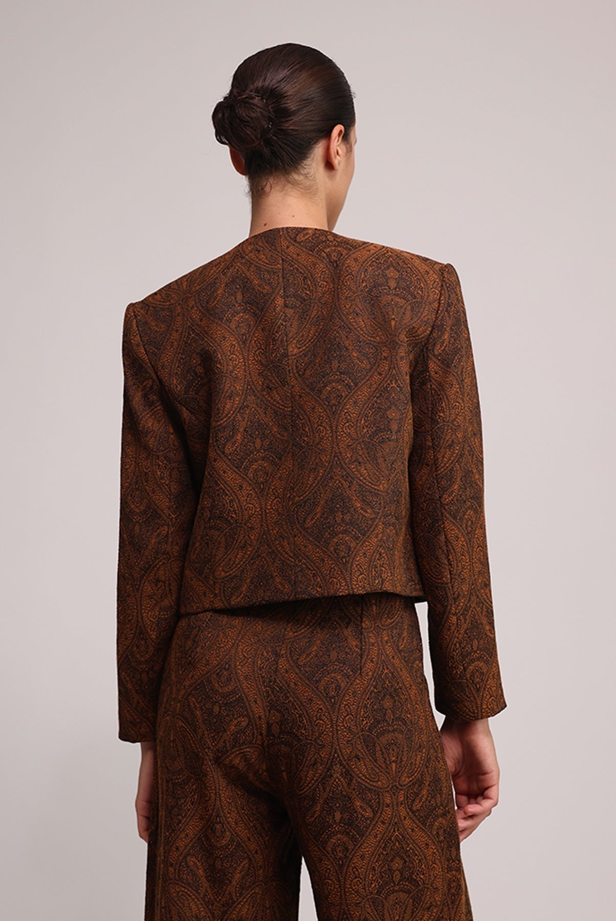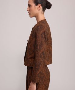 - Casual jacquard paisley lapel-less jacket.