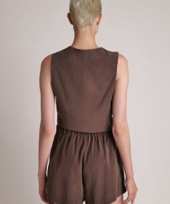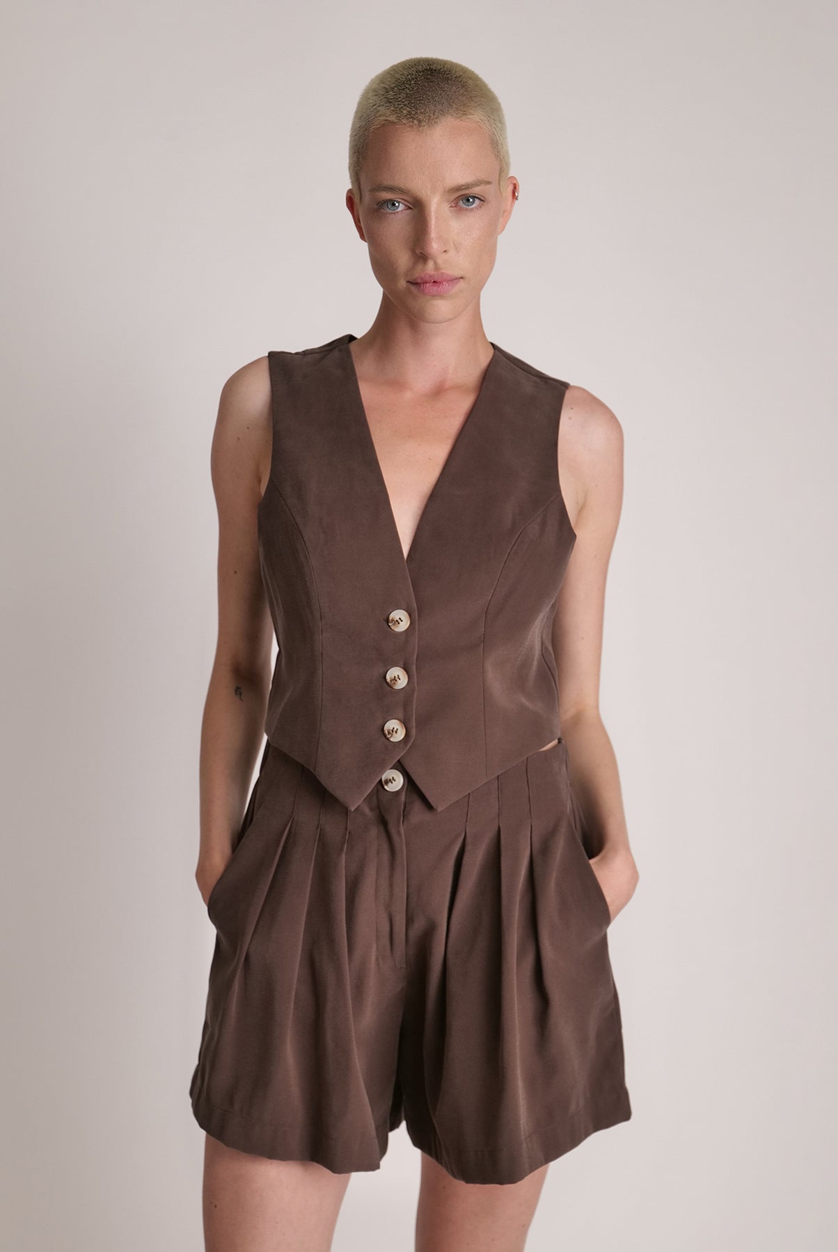 Diagonal viscose blend fitted waistcoat with a V-neckline, covered buttons on the front.