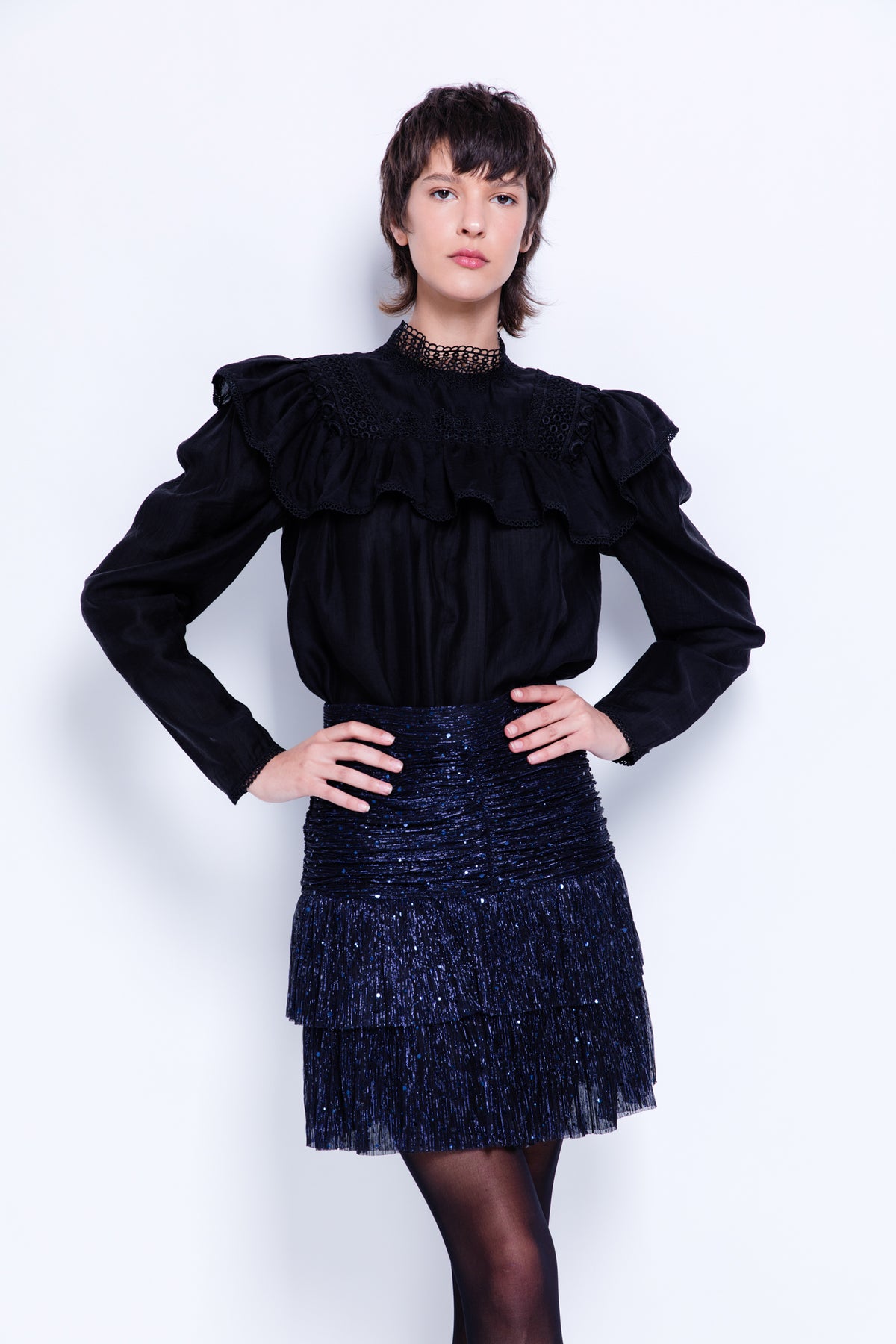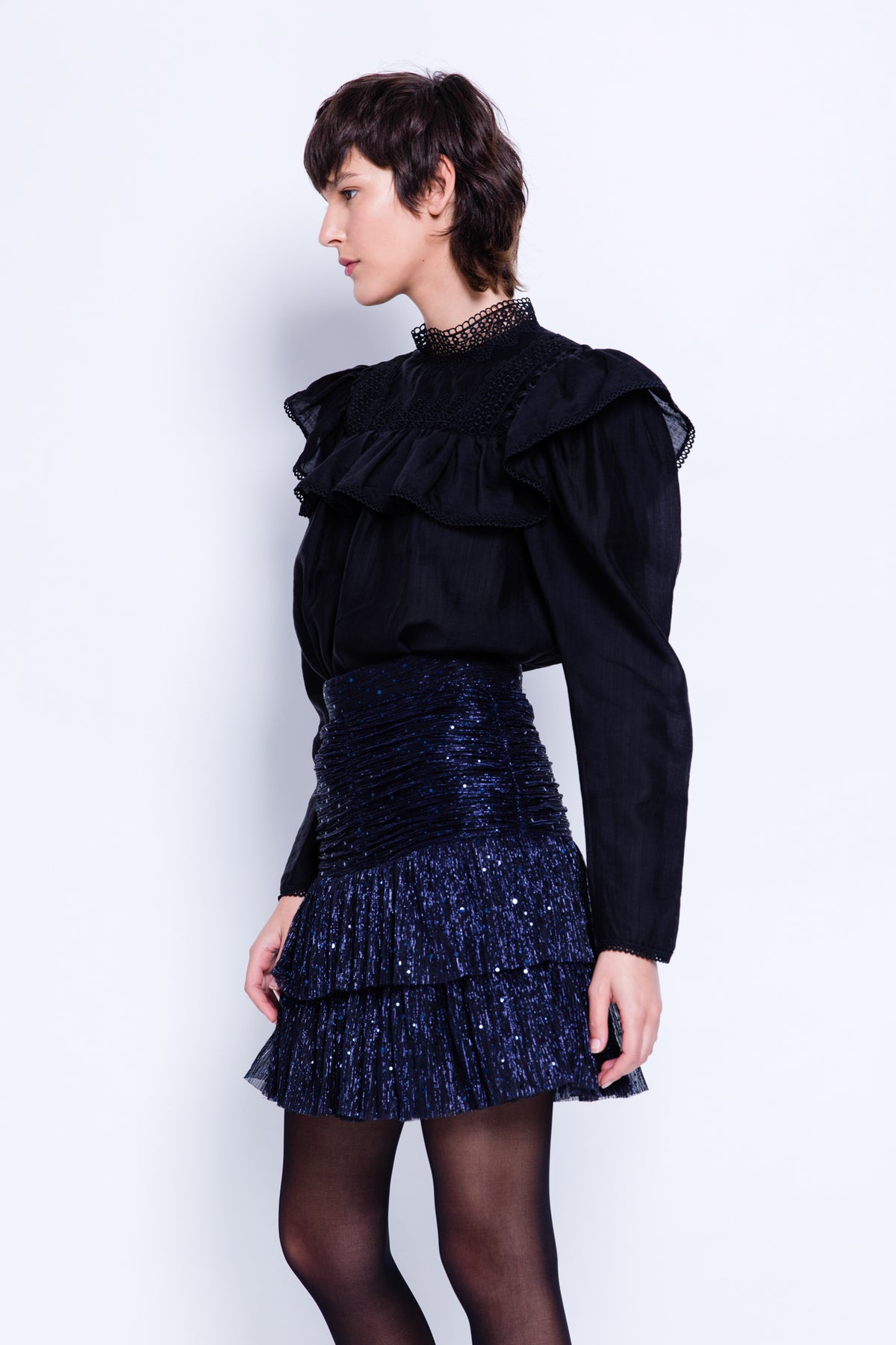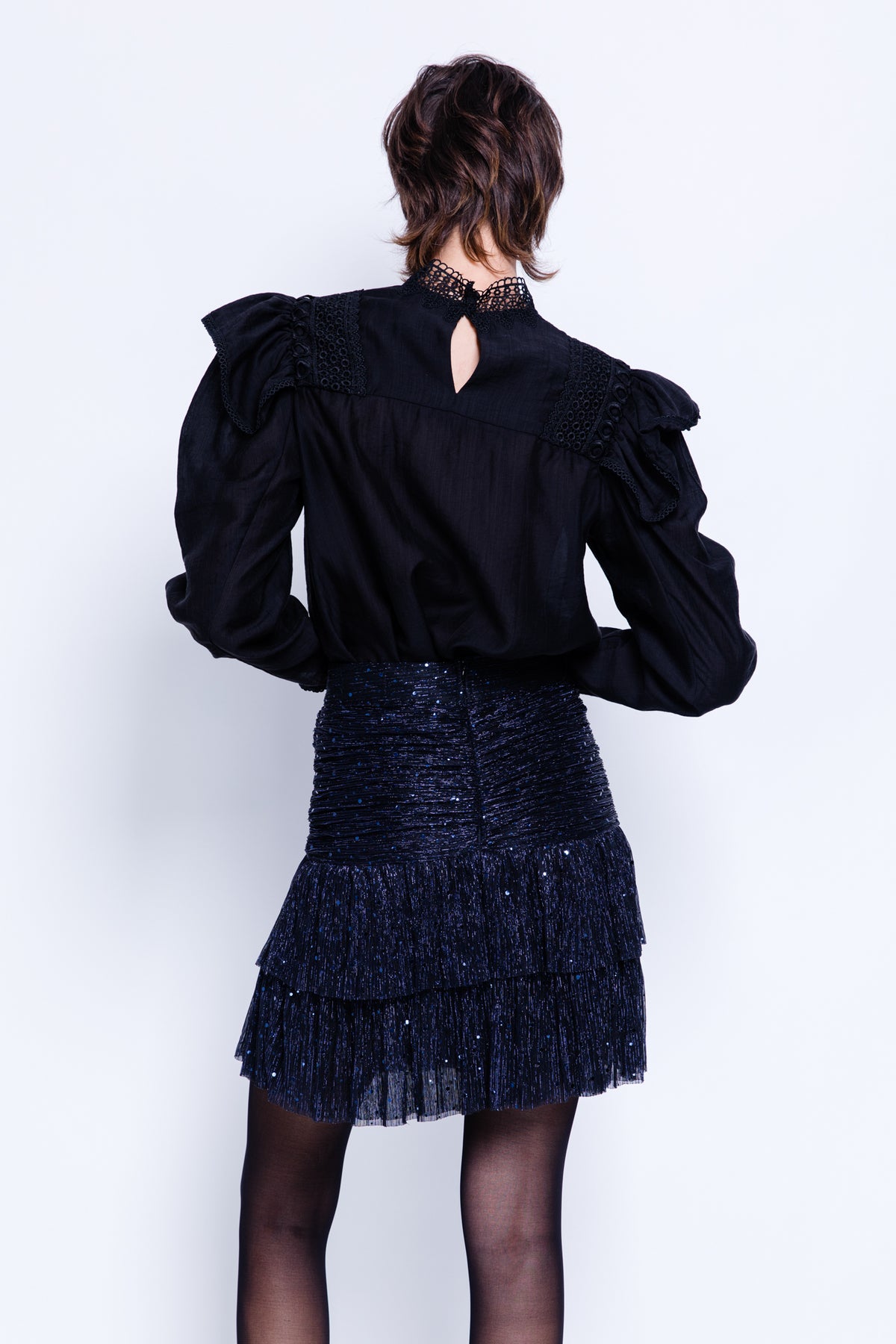 DescriptionWoven viscose top with peplum, high neck and crochet trim details.