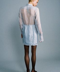 Embroidered chiffon mini dress with a collar, long sleeves, and button closure at center front.