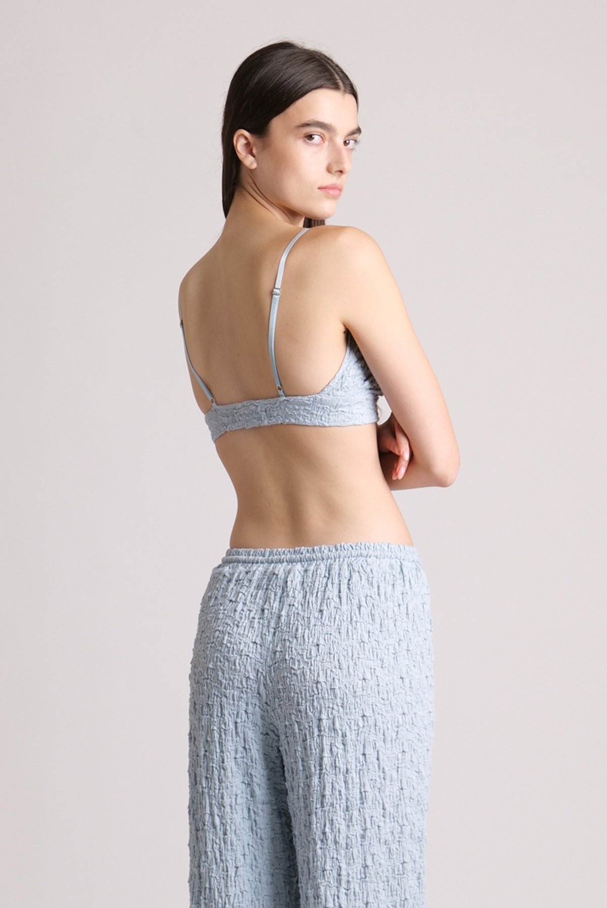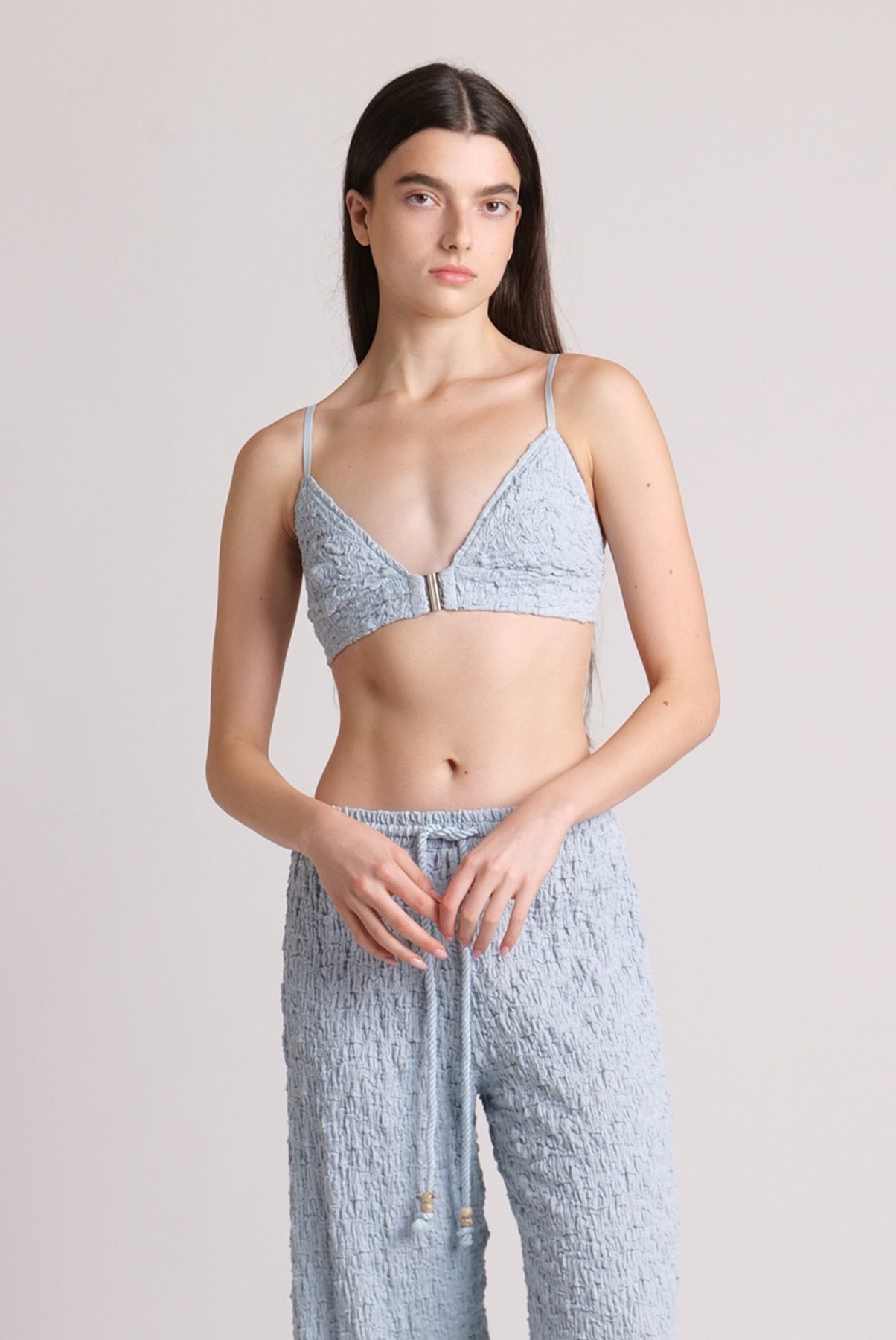 Crinkled knit bra with front buckle fastening.