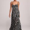 Pleated knit with foil layered maxi dress featuring corset top with back lacing, and removable straps.