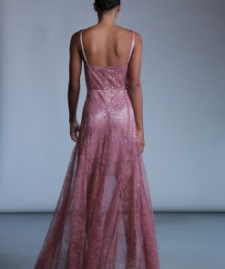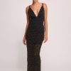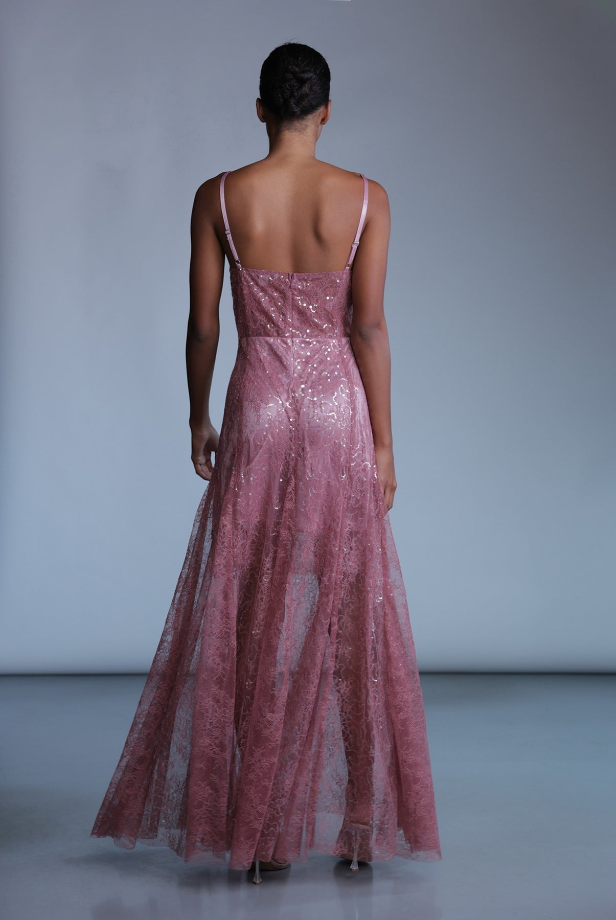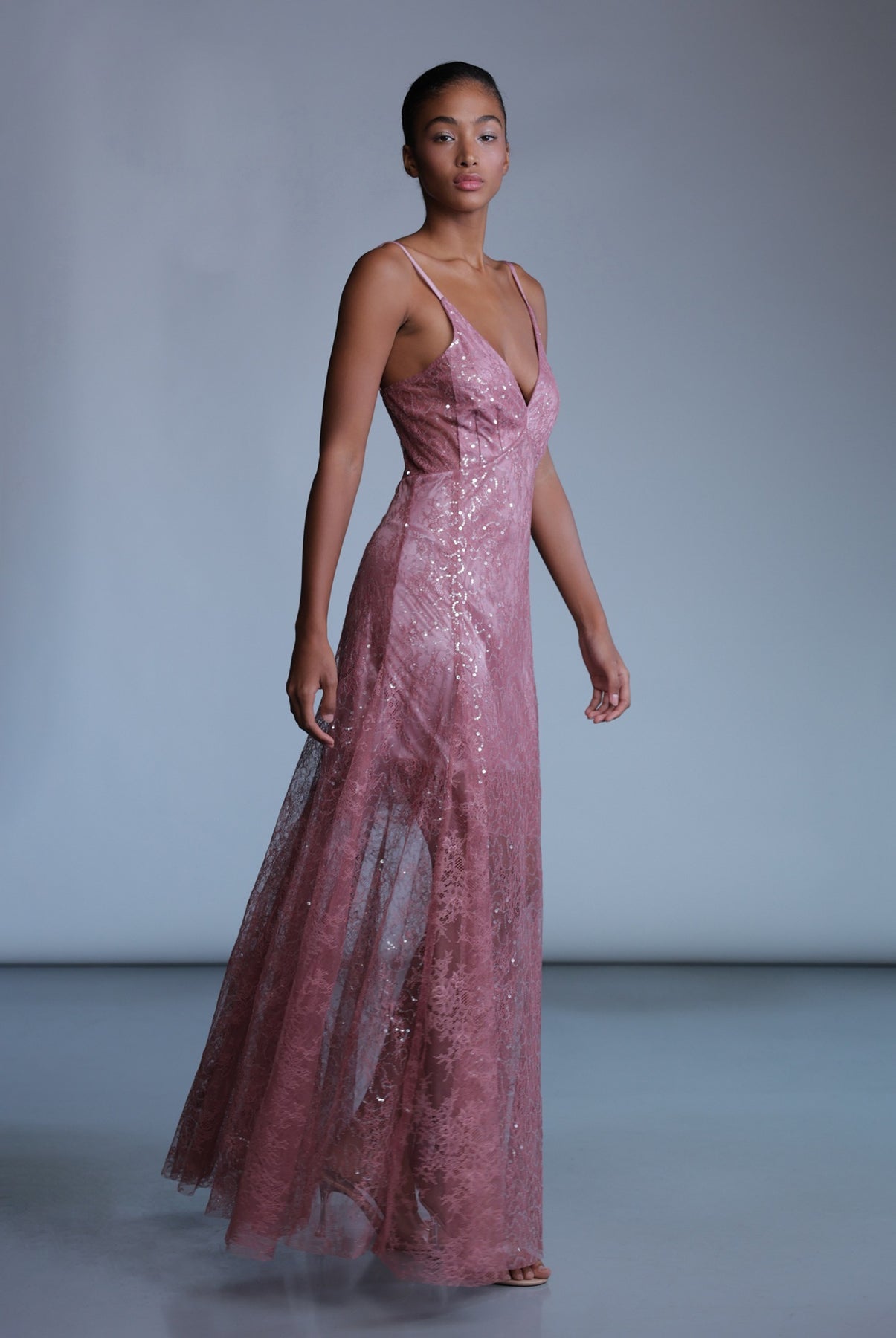 Sequined lace flaunting maxi dress with a V-neckline, thin adjustable straps and invisible zipper at the back.
