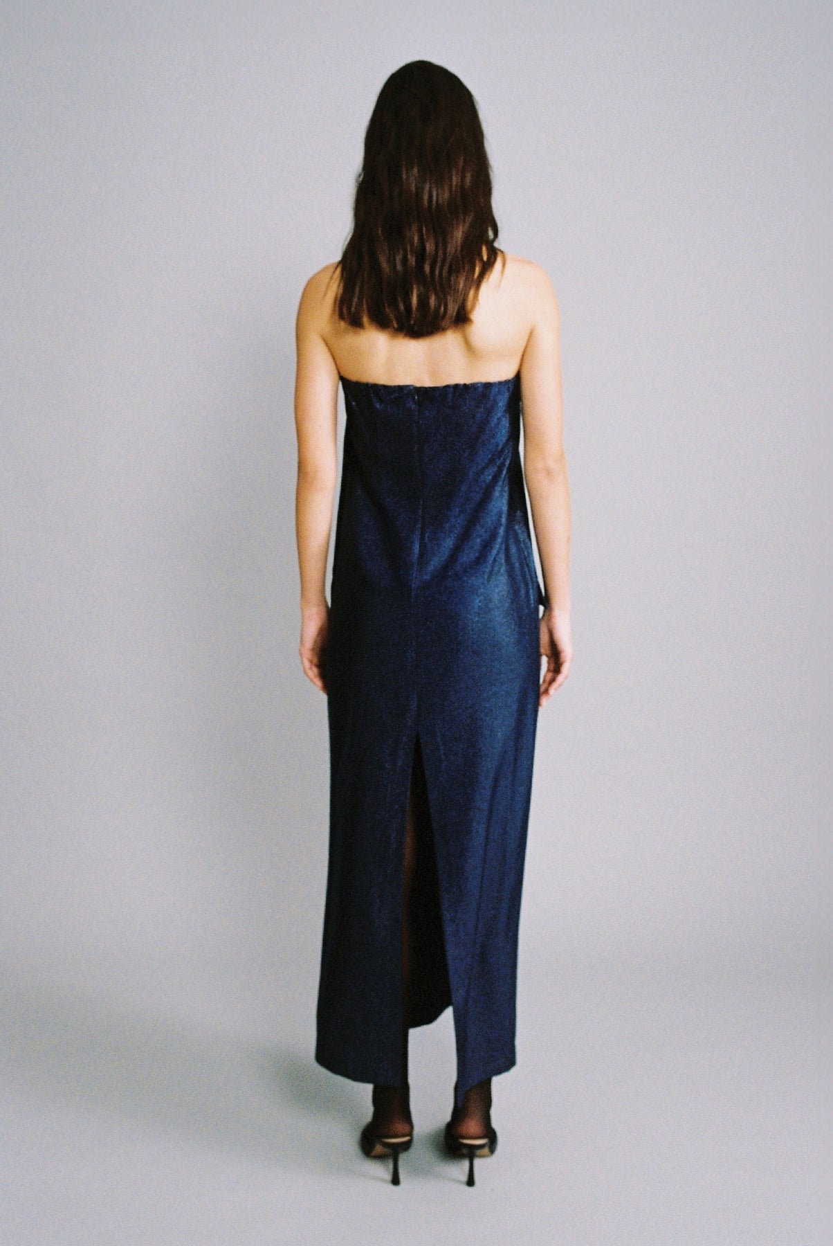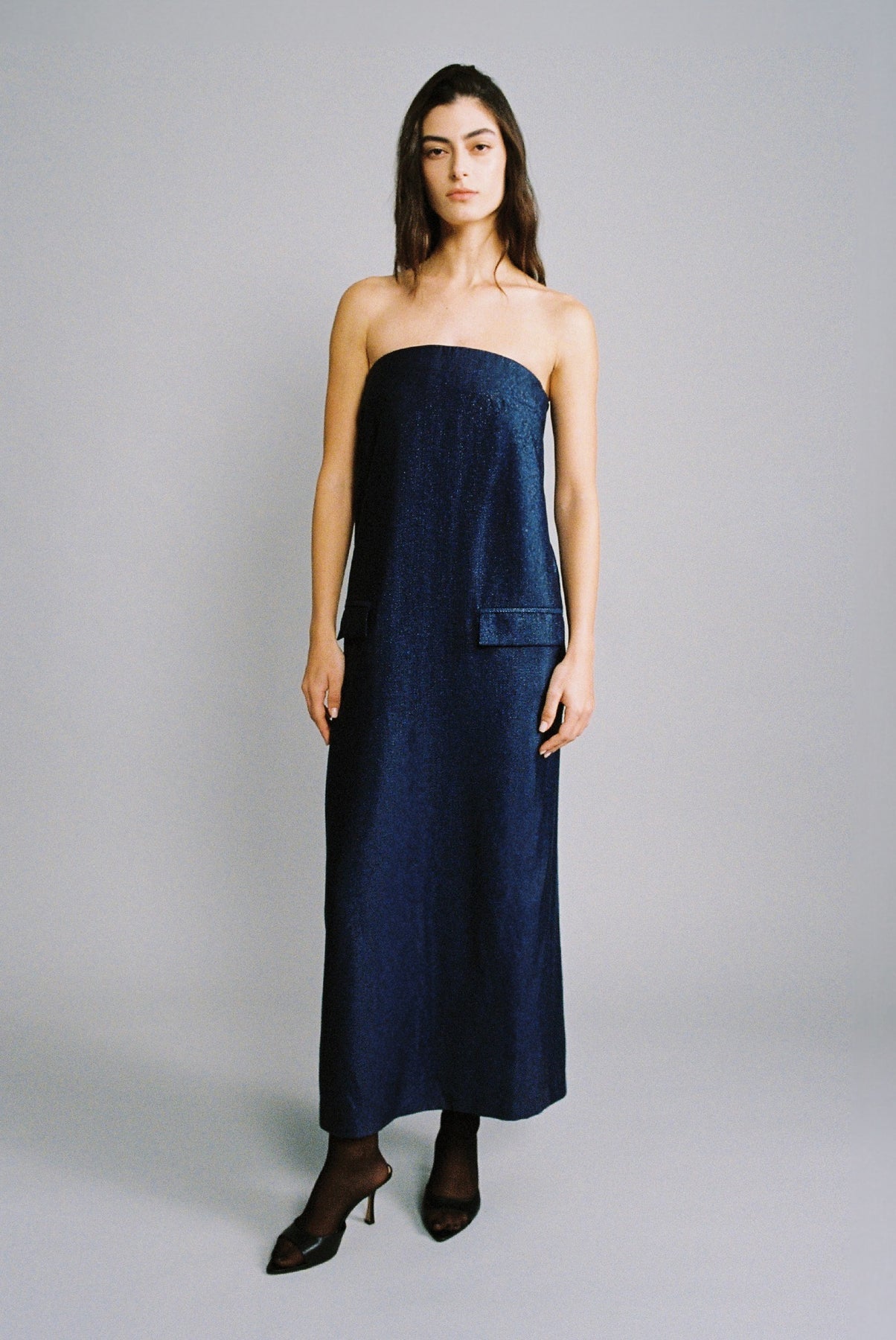 Rayon with lurex blend strapless midi dress featuring flap pockets, back slit at the hem, and invisible zipper at the back.
