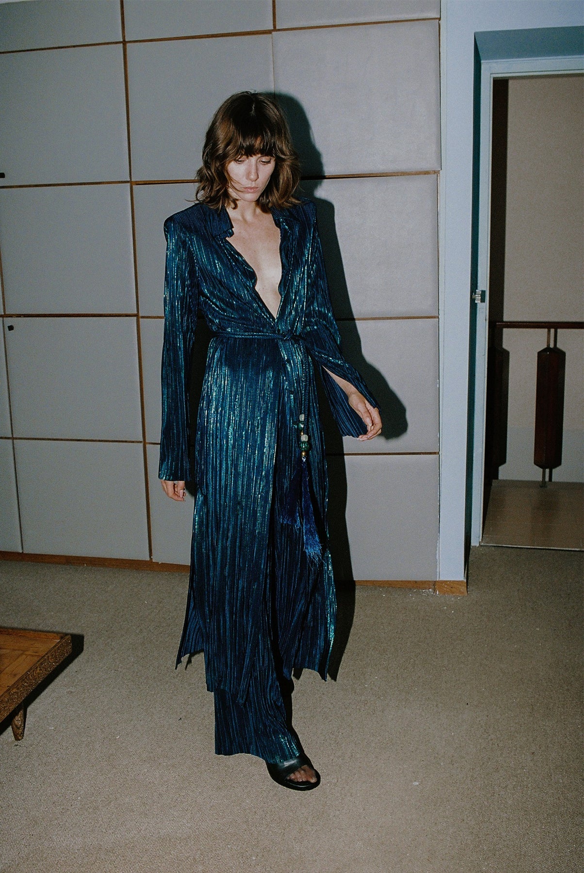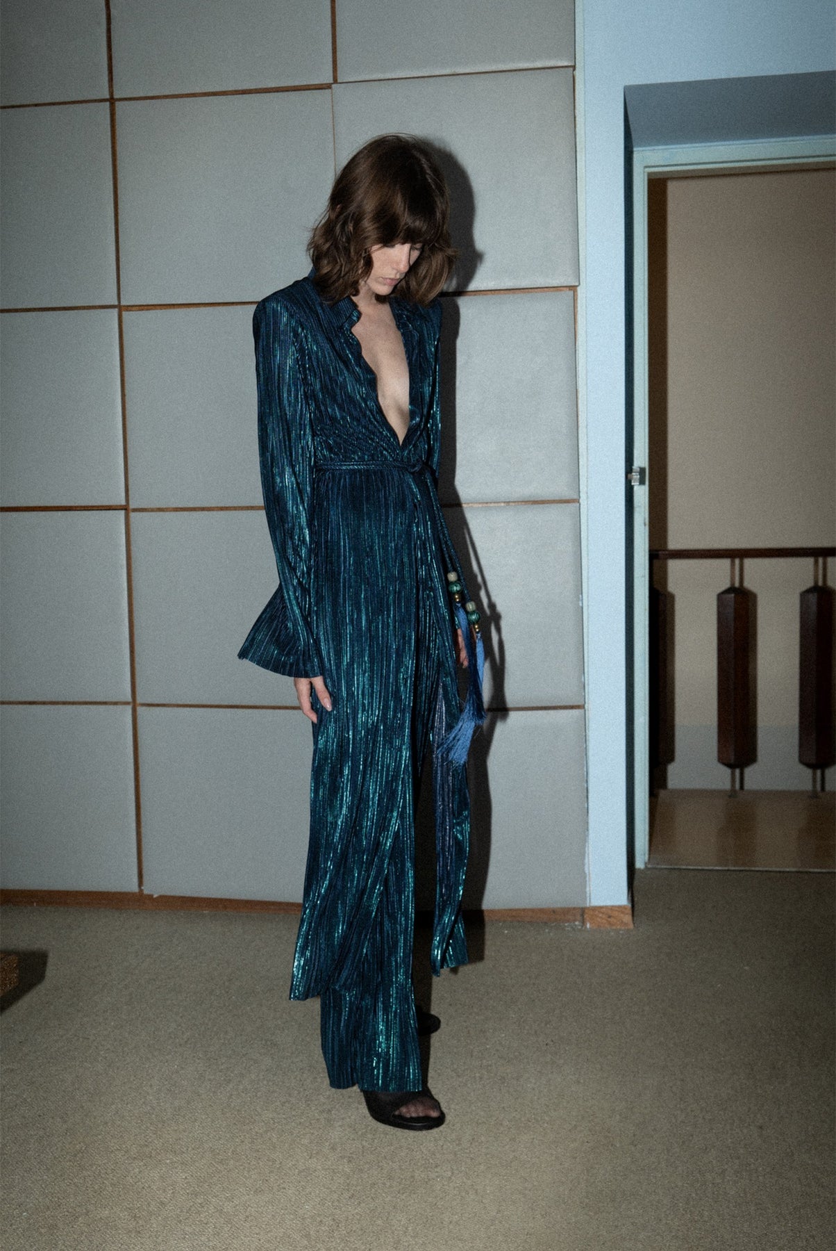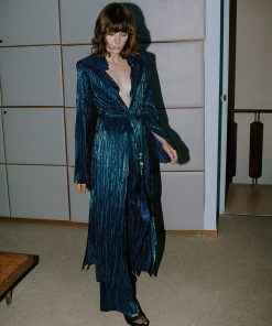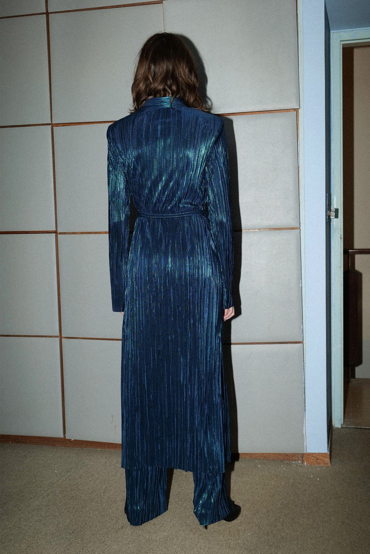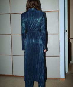 Pleated knit with foil high-waist straight leg pants, elastic waist at back, and invisible back zipper fastening.