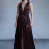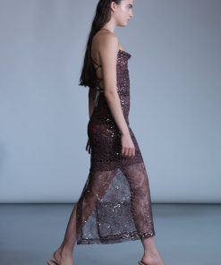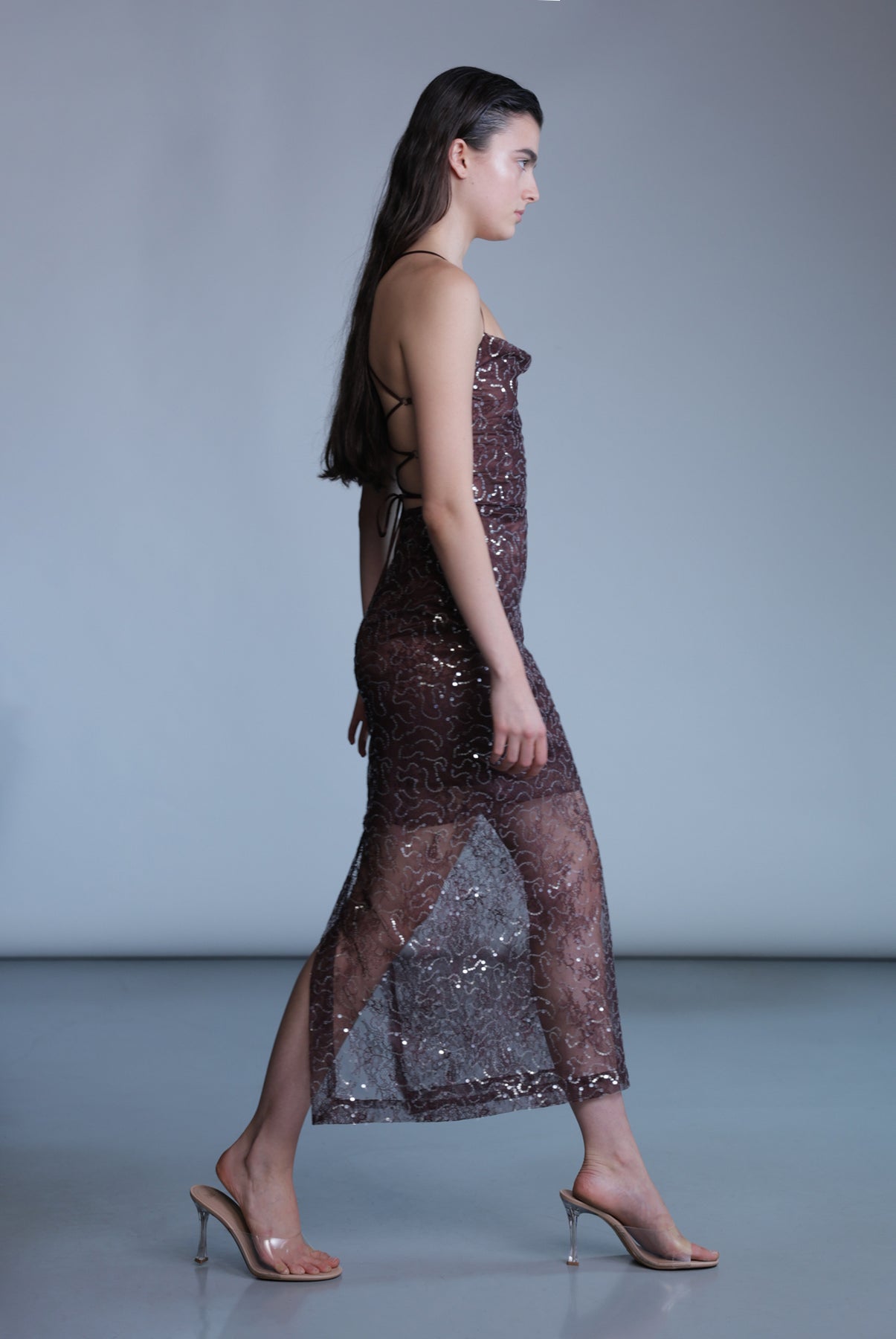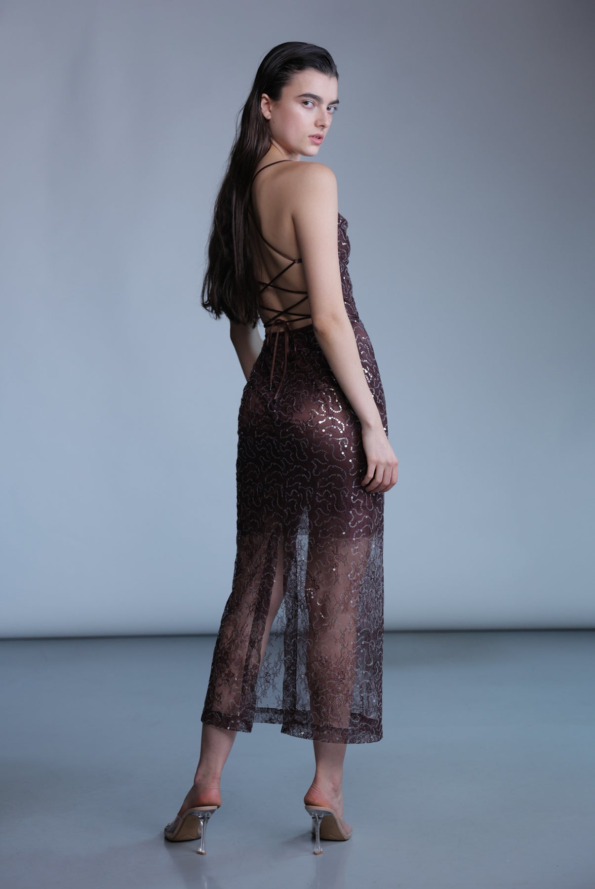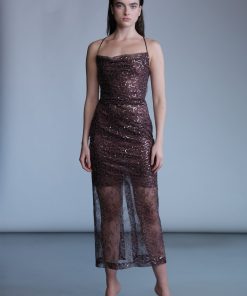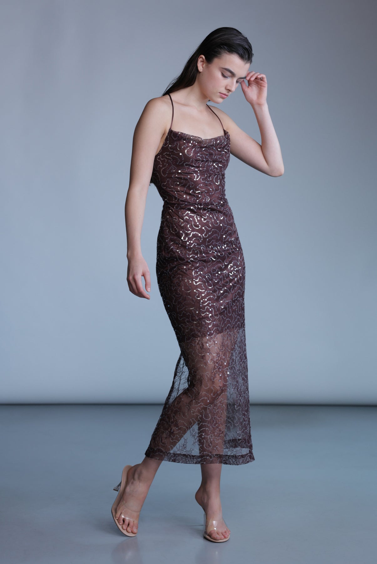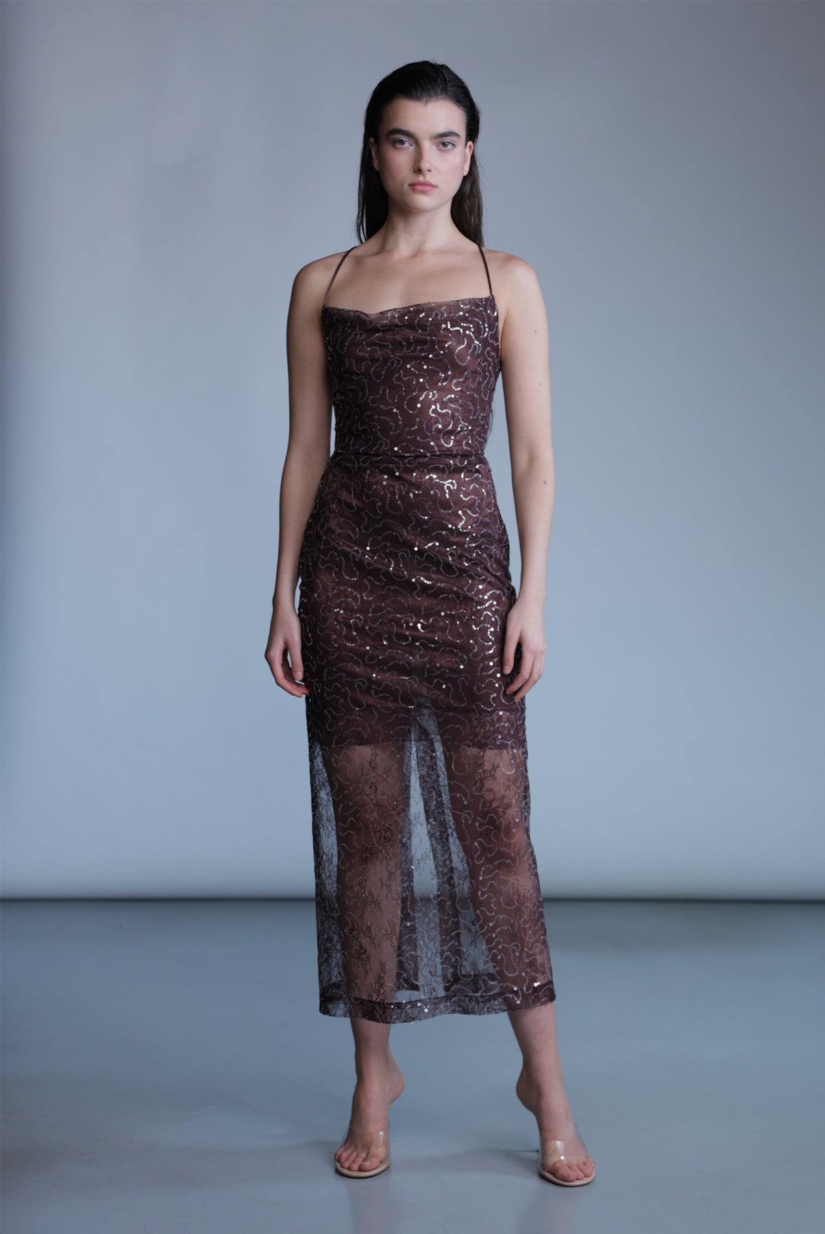 Sequined lace midi dress with a cowl neckline, adjustable straps that cross at the back with a tie, and an invisible zipper at the back with a slit at the hem.