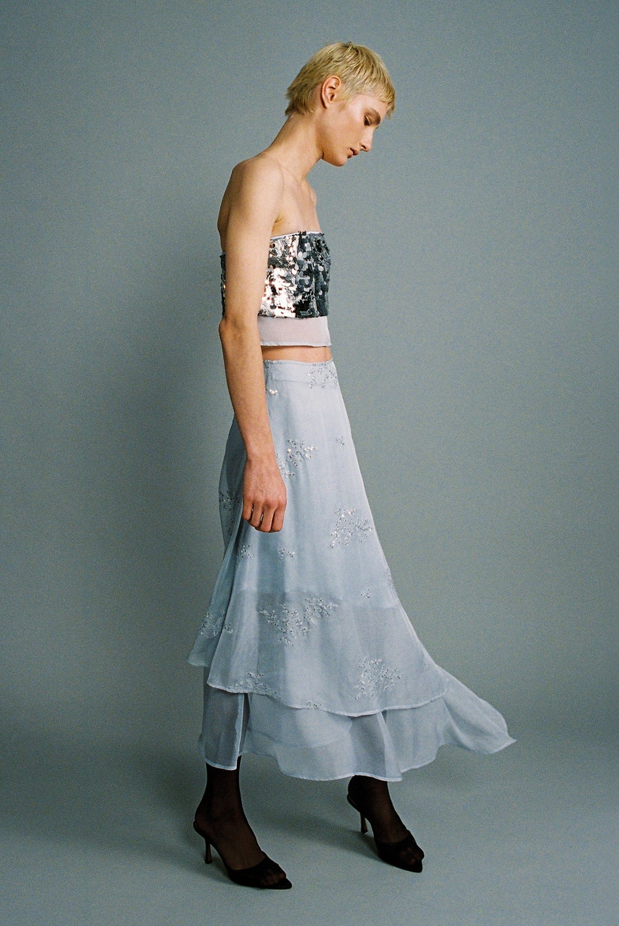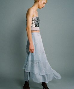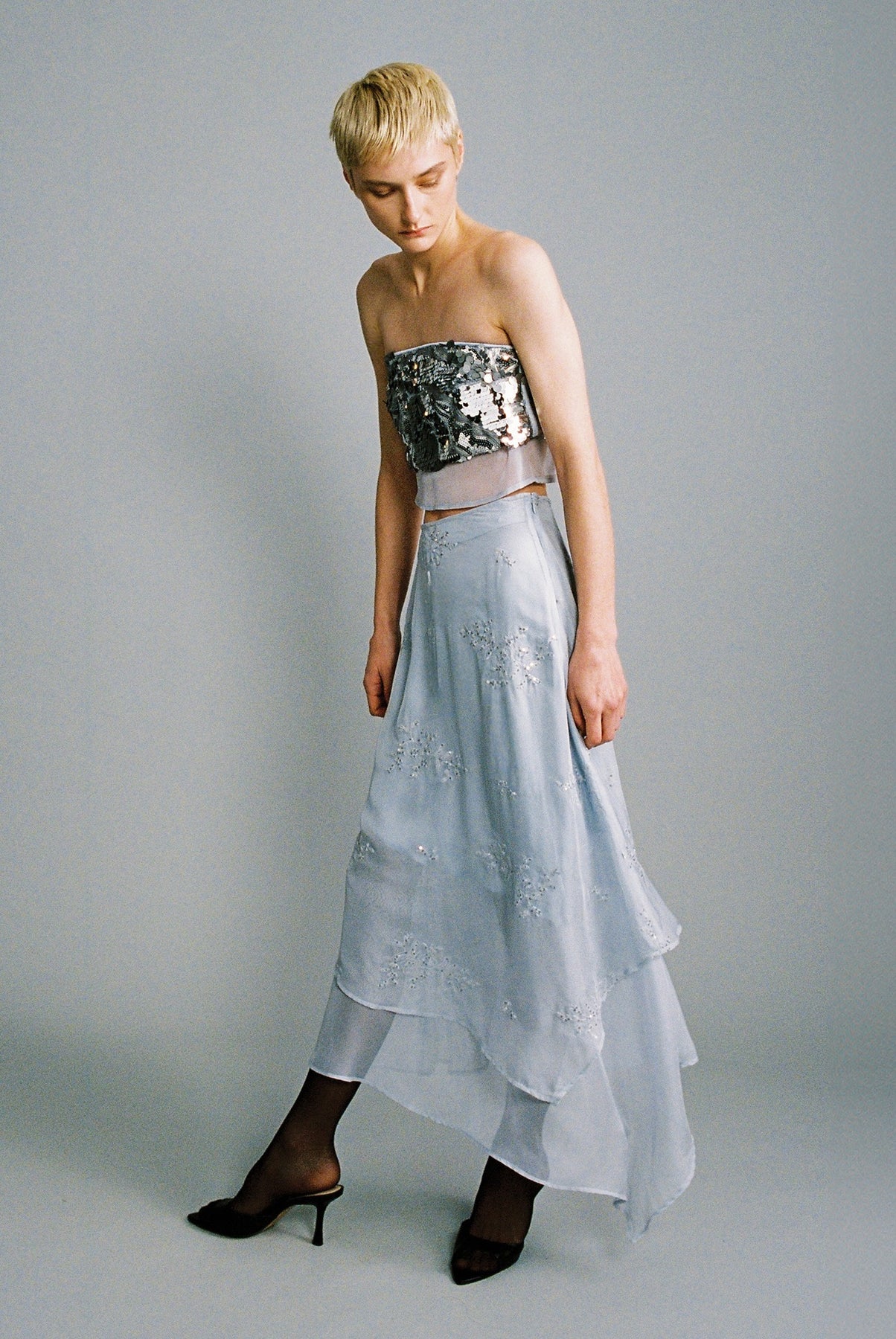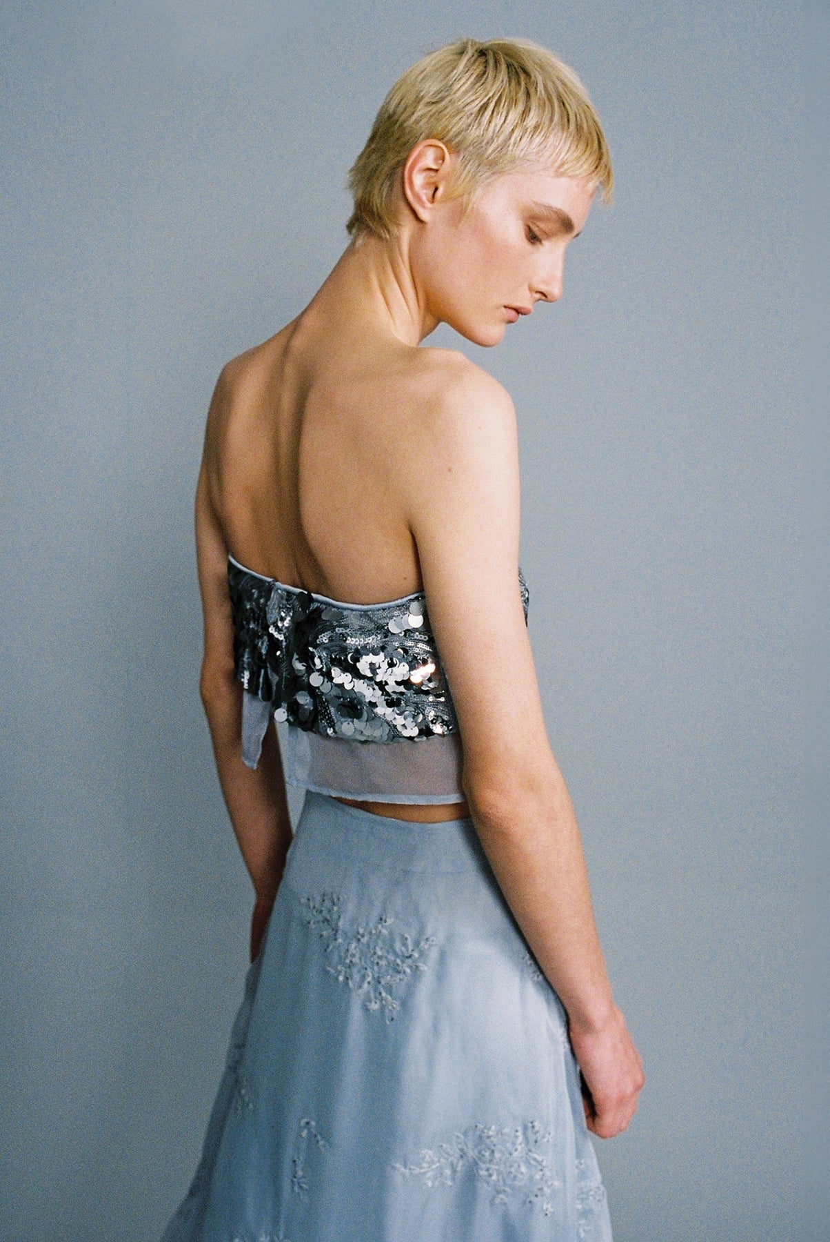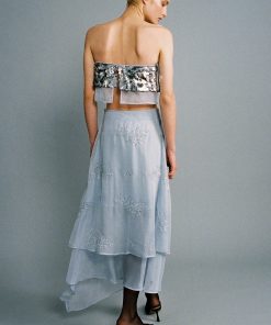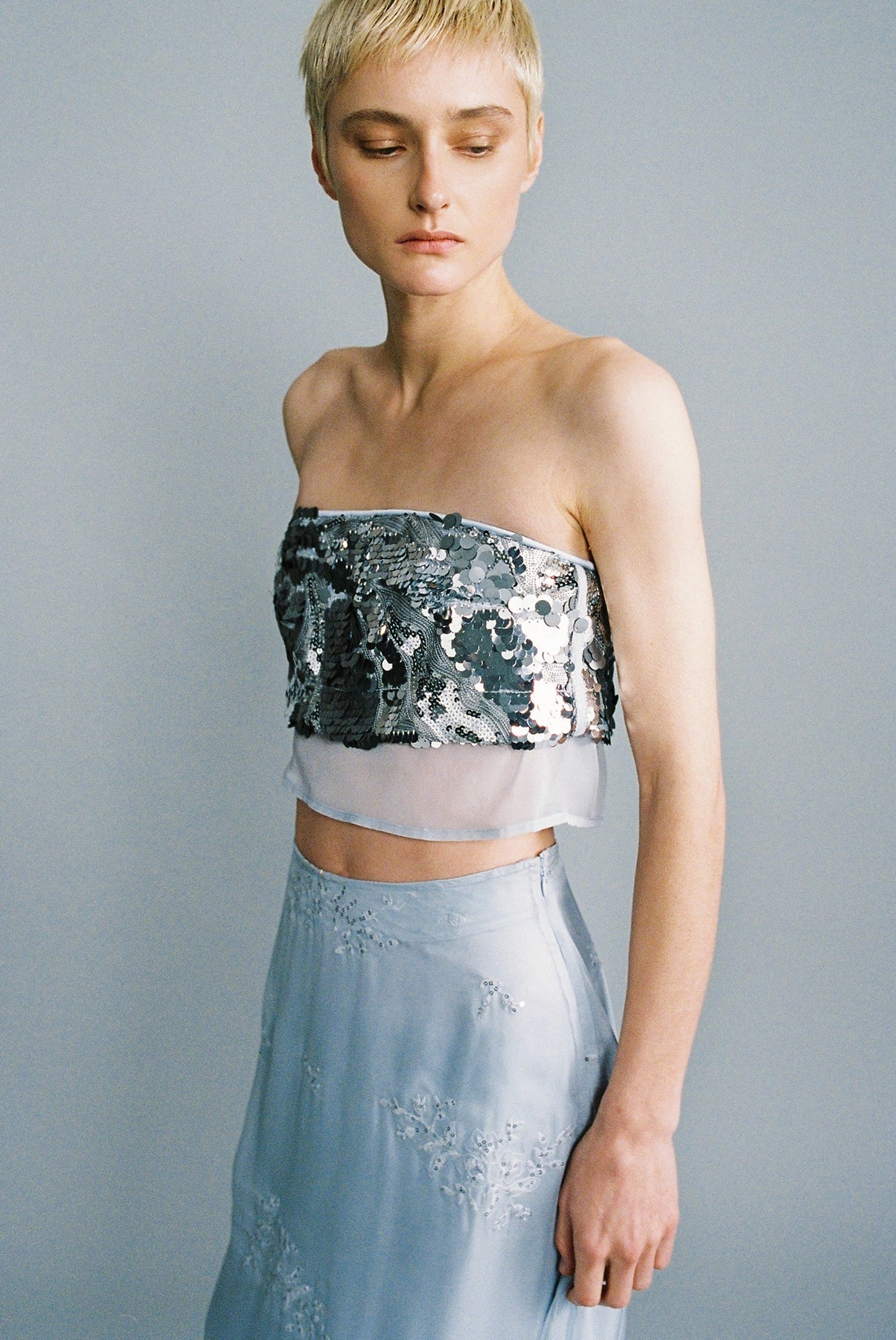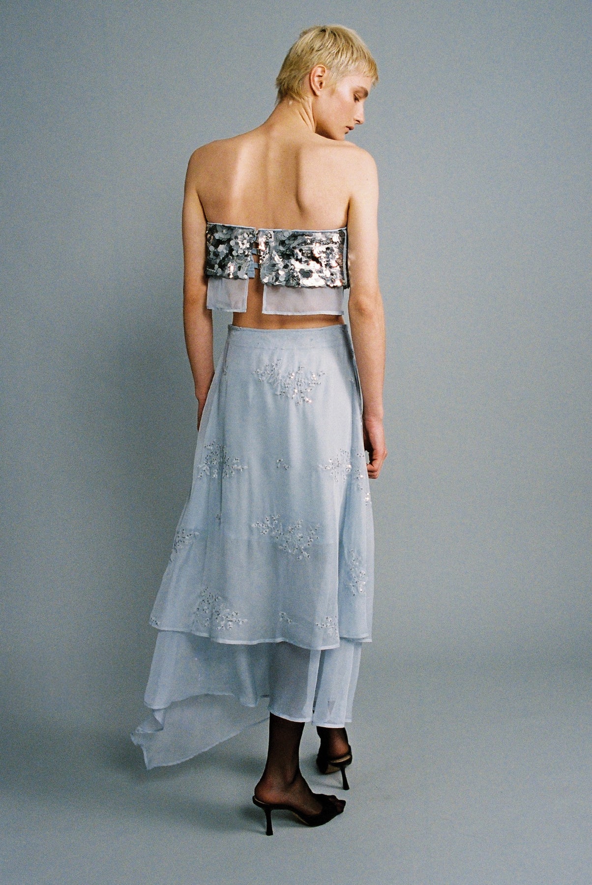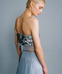 Gradient sequins on chiffon strapless crop top.