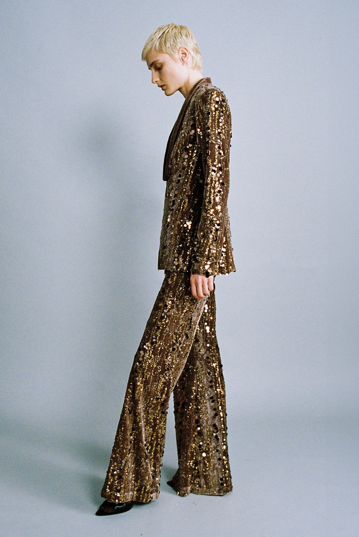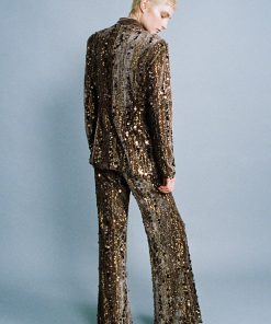 Stripe sequins on velvet top with deep V – neckline, long sleeves, and flap pockets.