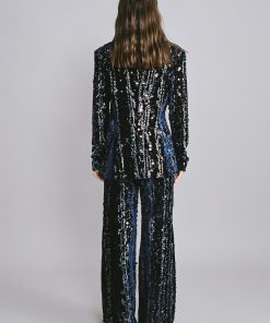 Stripe sequins on velvet top with deep V – neckline, long sleeves, and flap pockets.