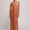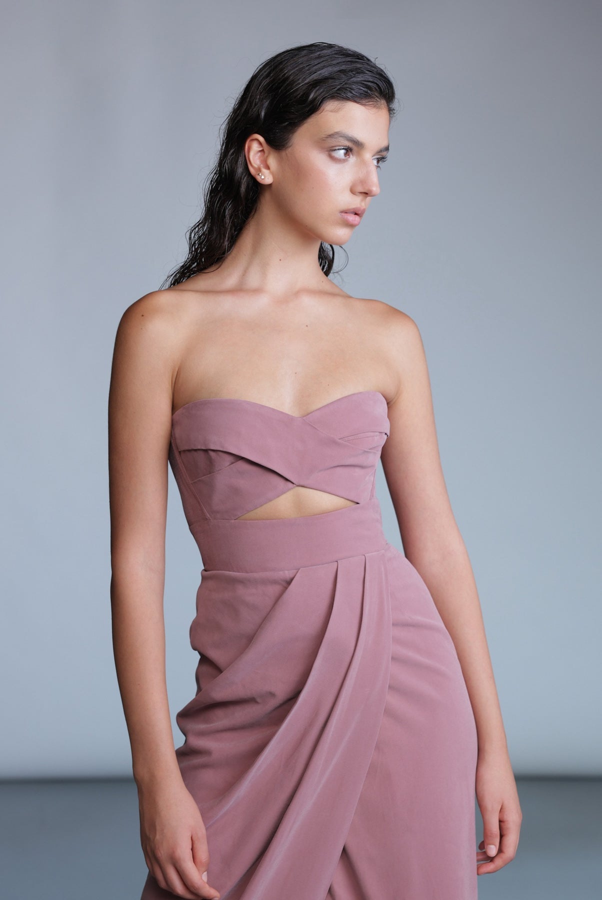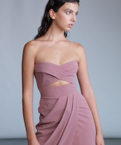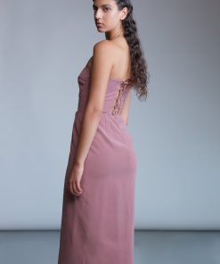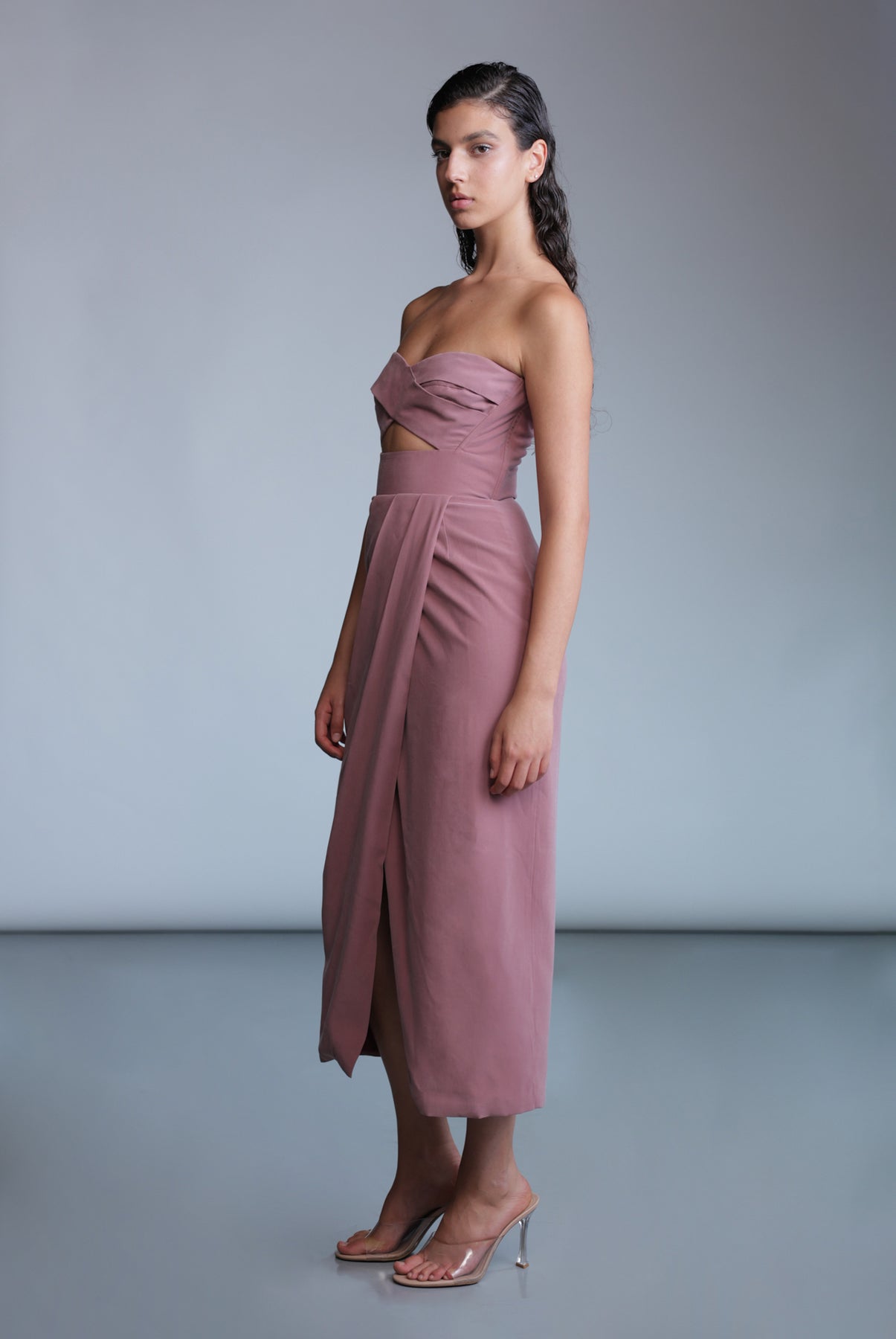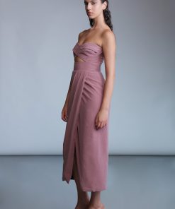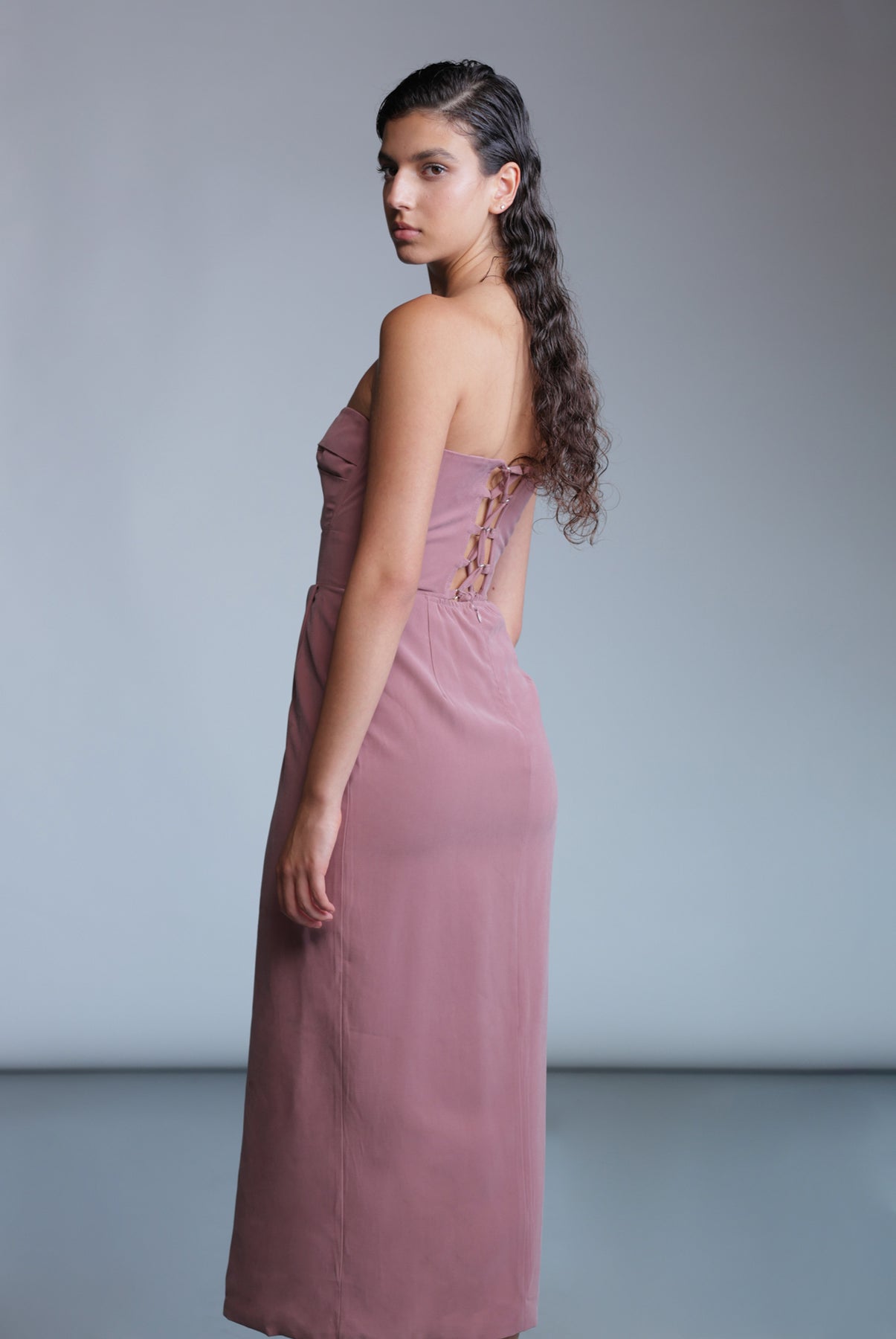 Diagonal viscose blend strapless midi dress with a twisted front detail, cutout, and back lacing with detachable straps. A pencil skirt with gathering details, front slit, and invisible zipper at the back.