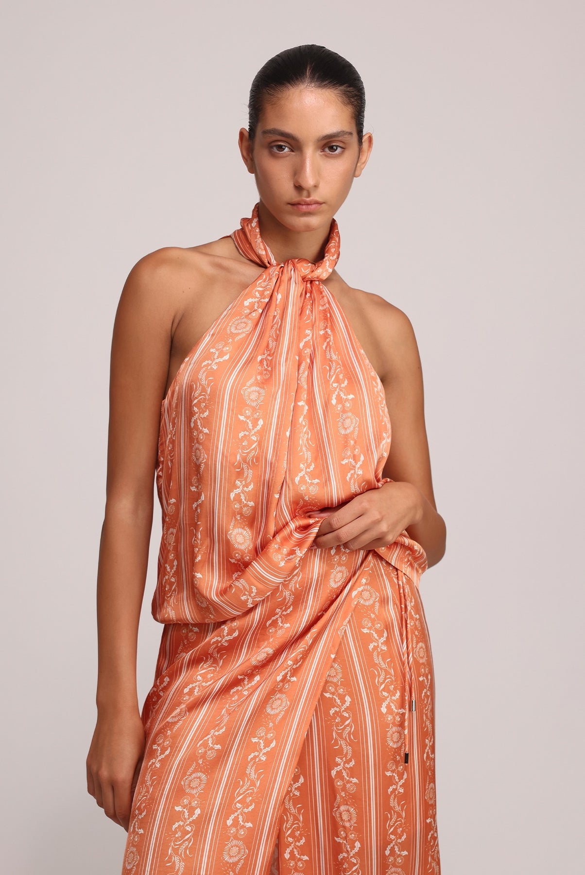 - Casual stripe print on satin top by Sabina Musayev.