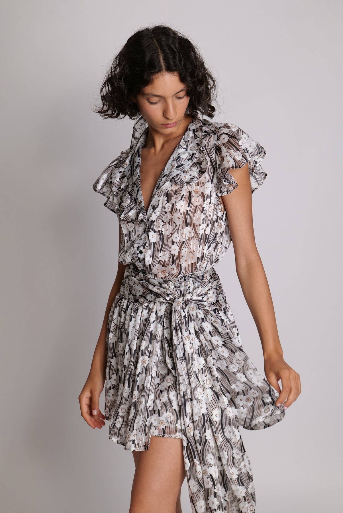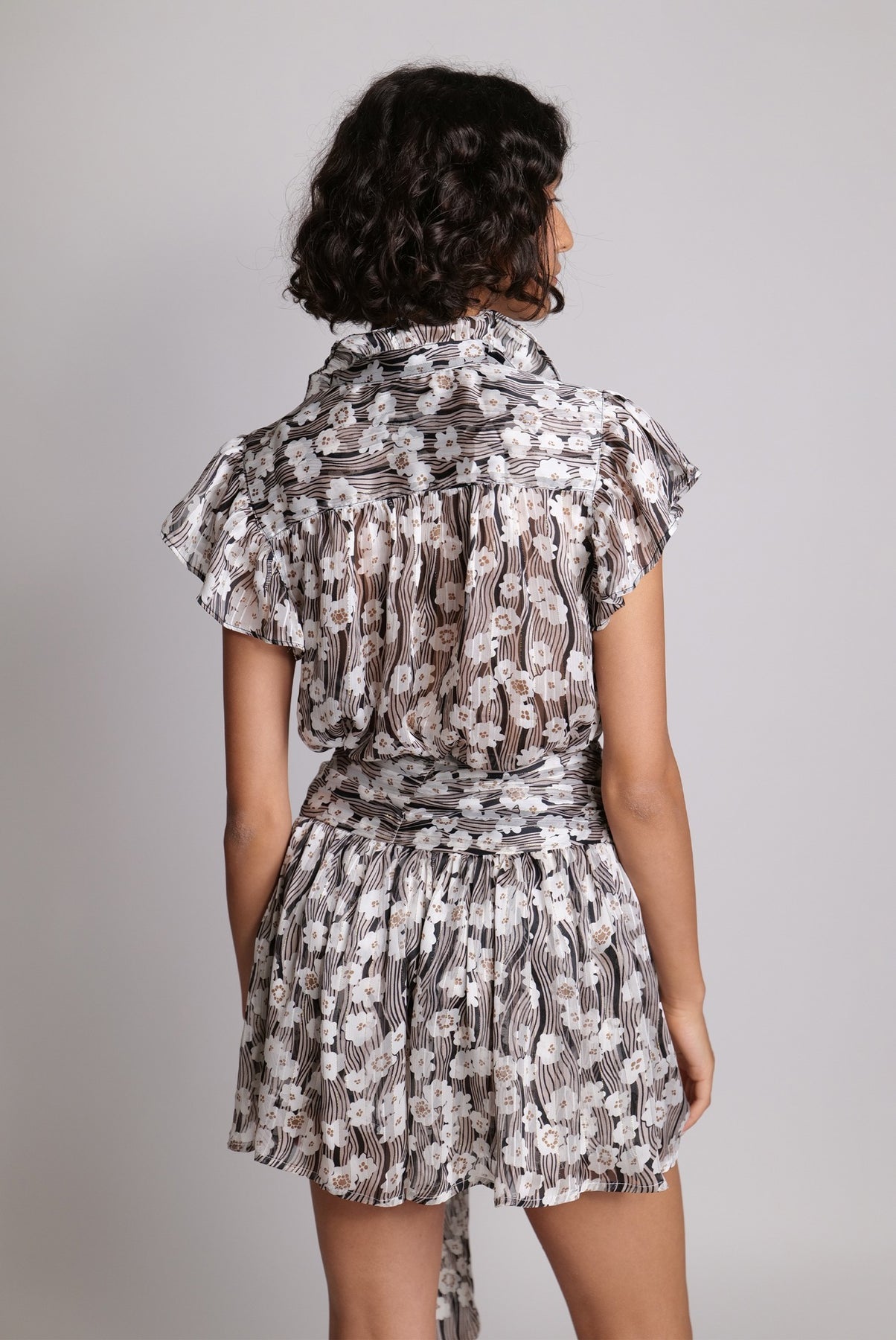 Printed chiffon High waist flared mini skirt with gathering waist belt tie detail.
