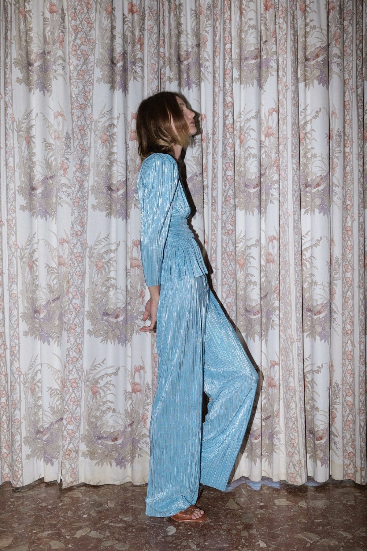 Pleated knit with foil high-waist straight leg pants, elastic waist at back with invisible zipper.