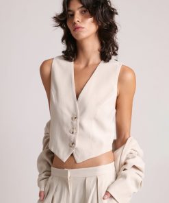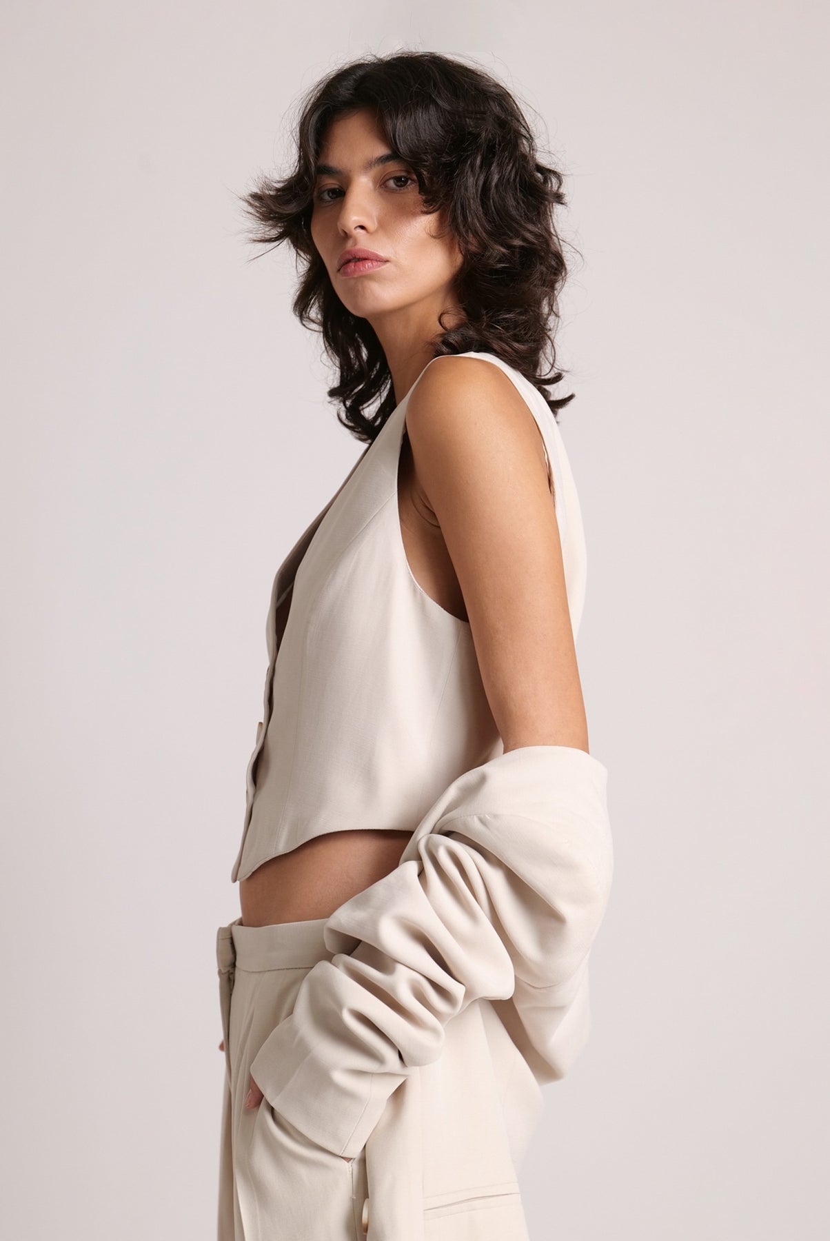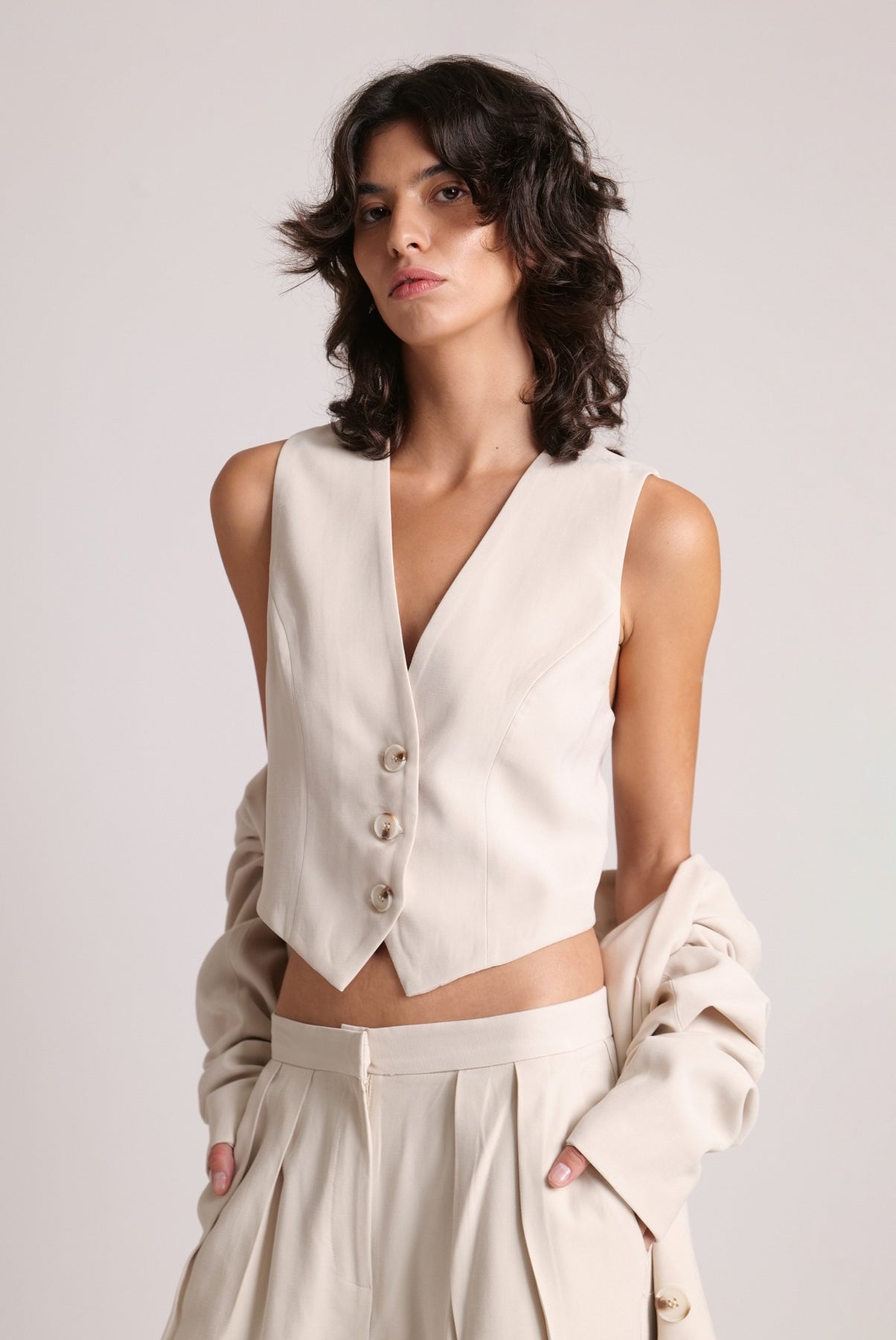 Diagonal viscose blend fitted waistcoat with a V-neckline, covered buttons on the front.