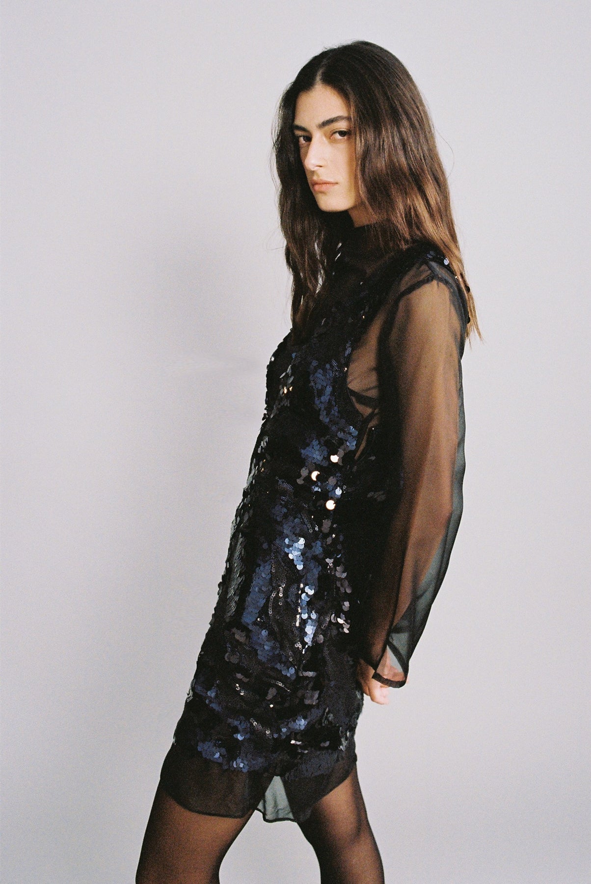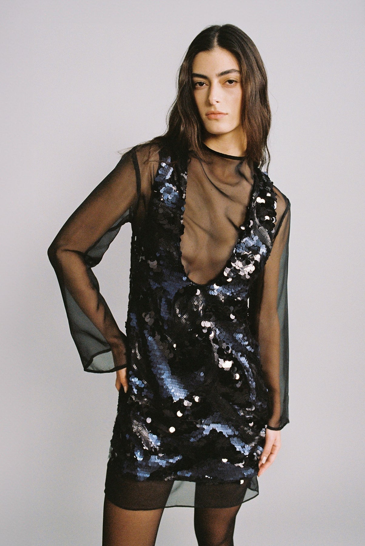 Gradient sequins on chiffon sleeveless mini dress with a deep V neckline.