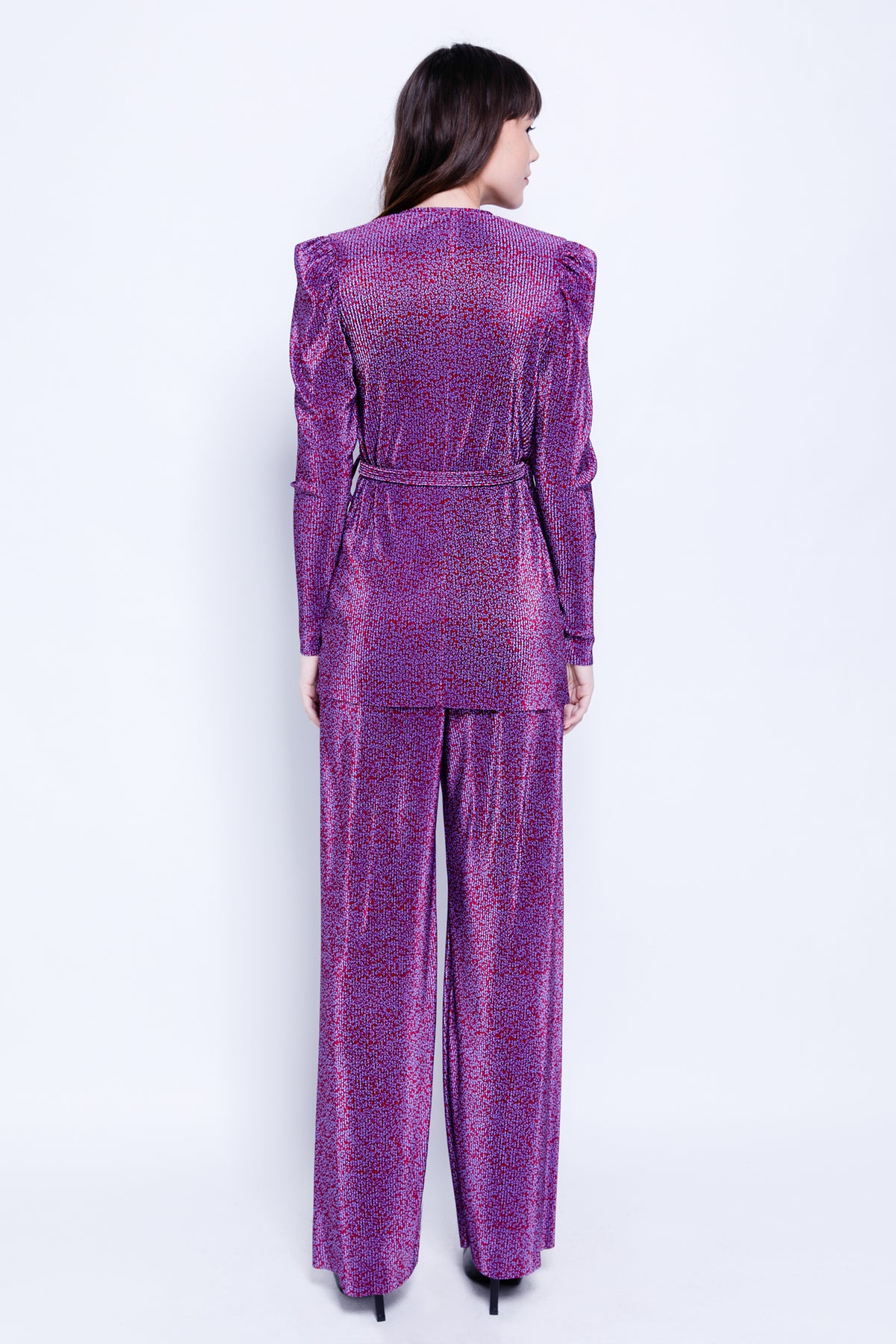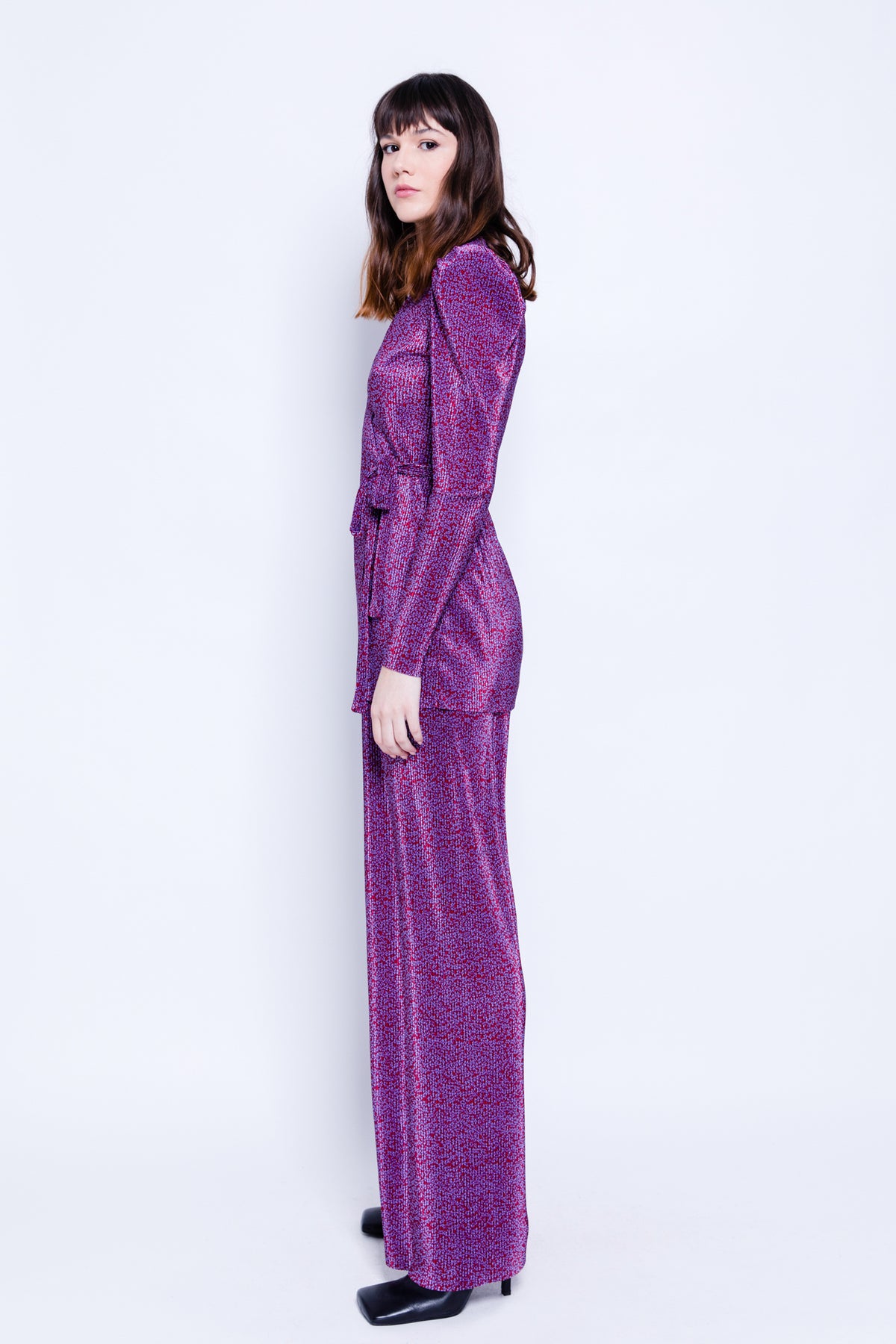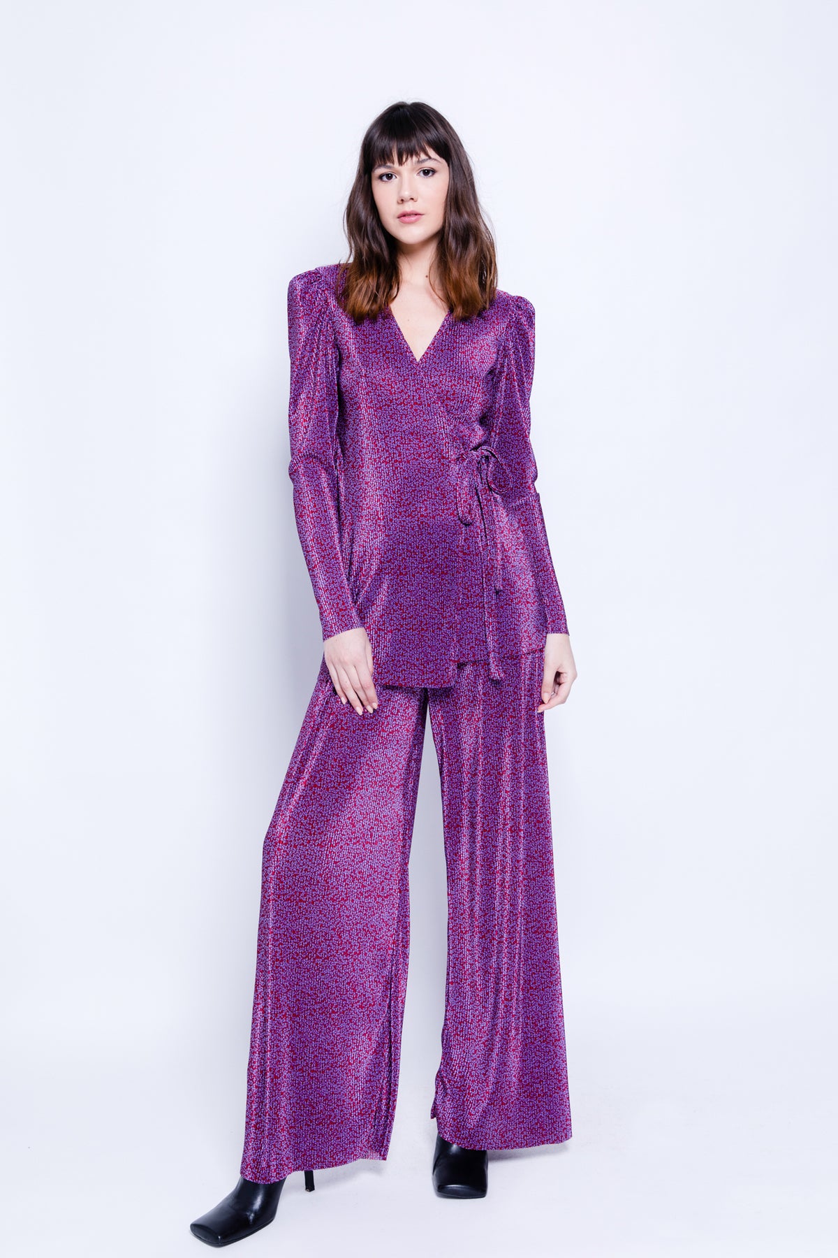 DescriptionPrinted pleated knit high waisted wide leg pants.