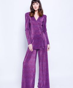 DescriptionPrinted pleated knit high waisted wide leg pants.