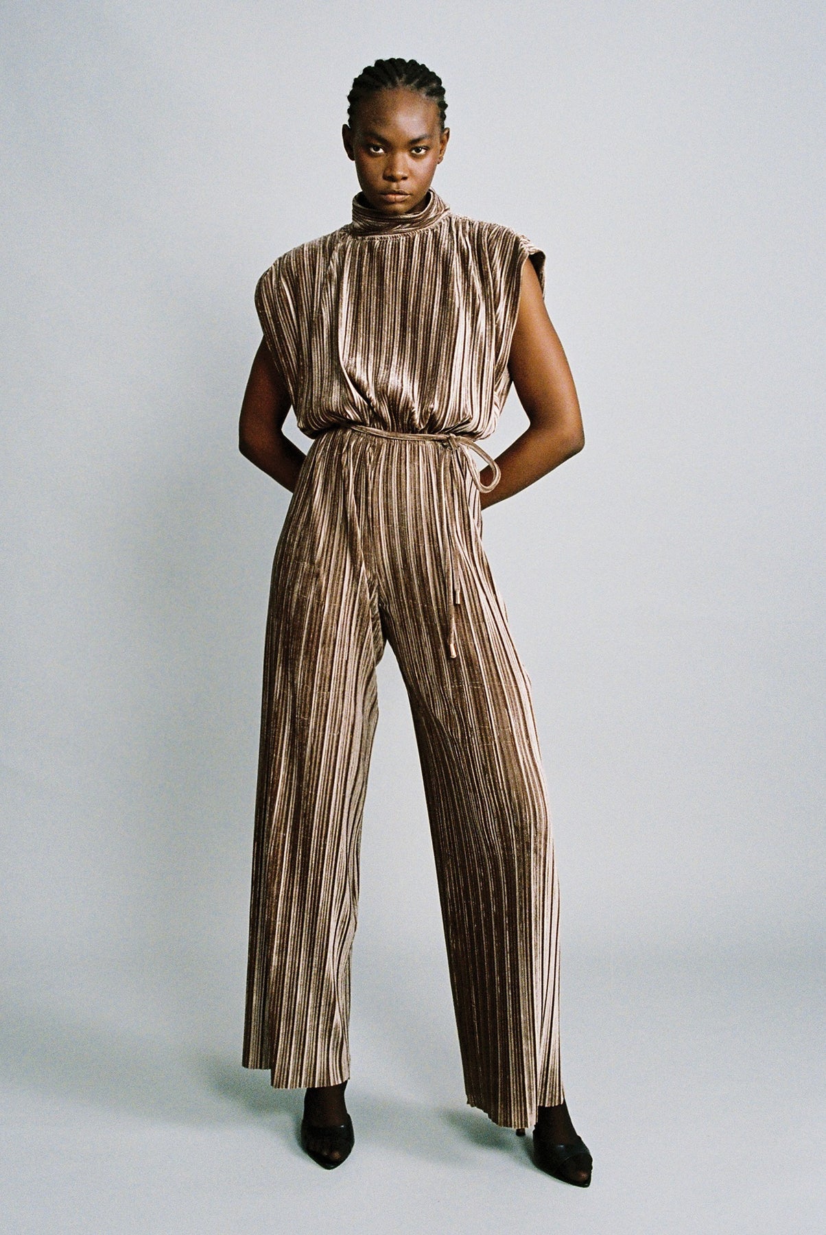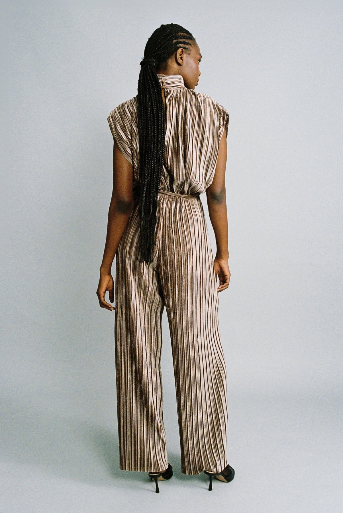 Pleated velvet sleeveless jumpsuit.