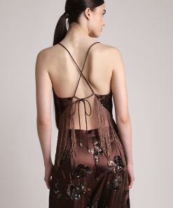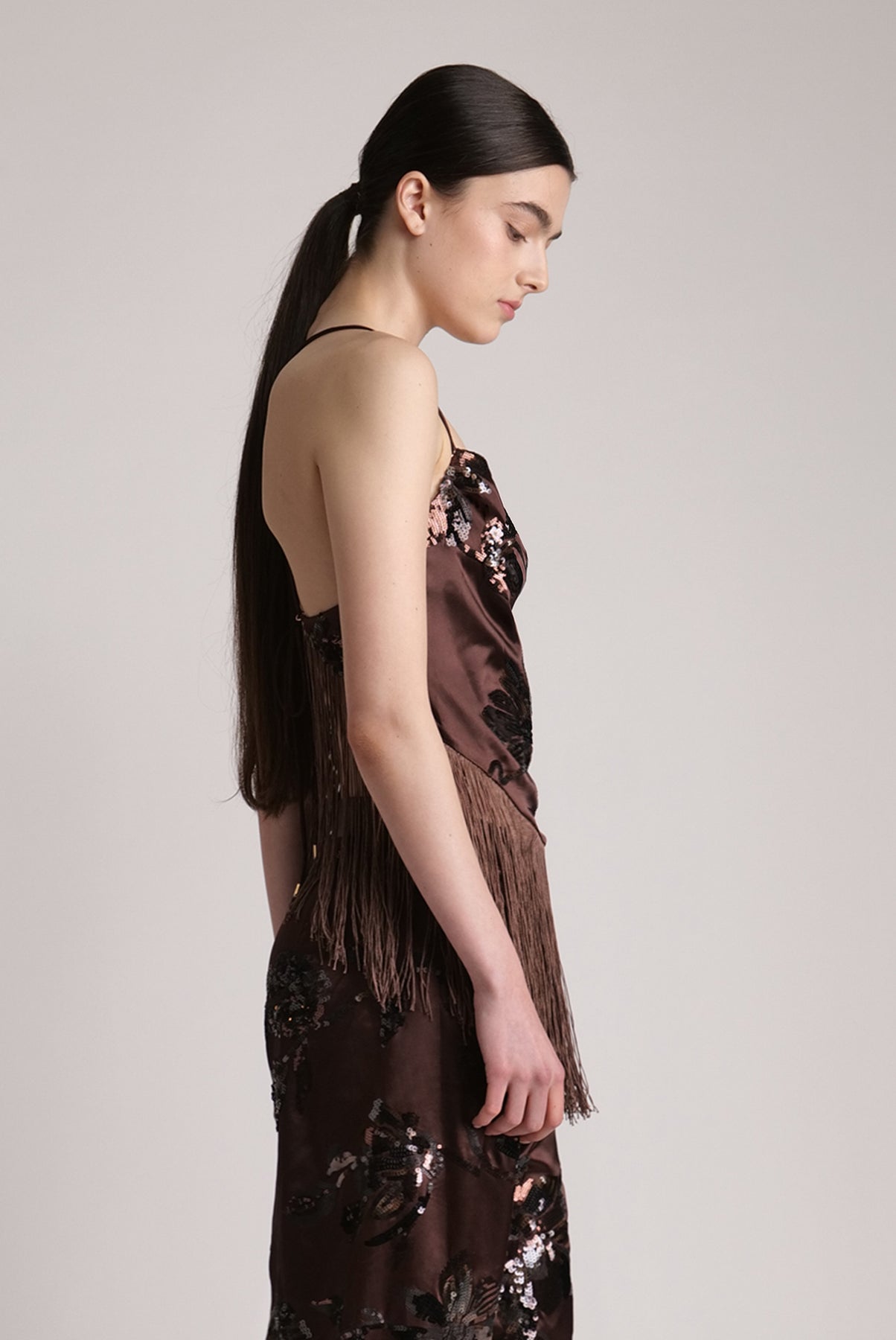 Blossom sequins on satin top with an adjustable halter neck, and tie back.