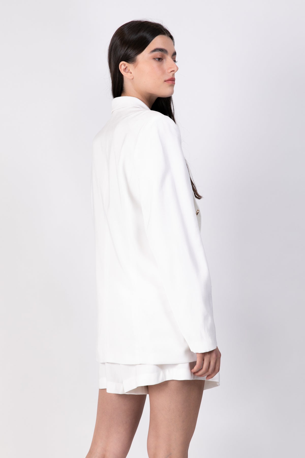 DescriptionDouble face diagonal viscose blend tailored jacket with shoulder pads, pockets, and unique golden buttons.
