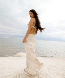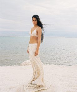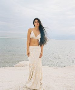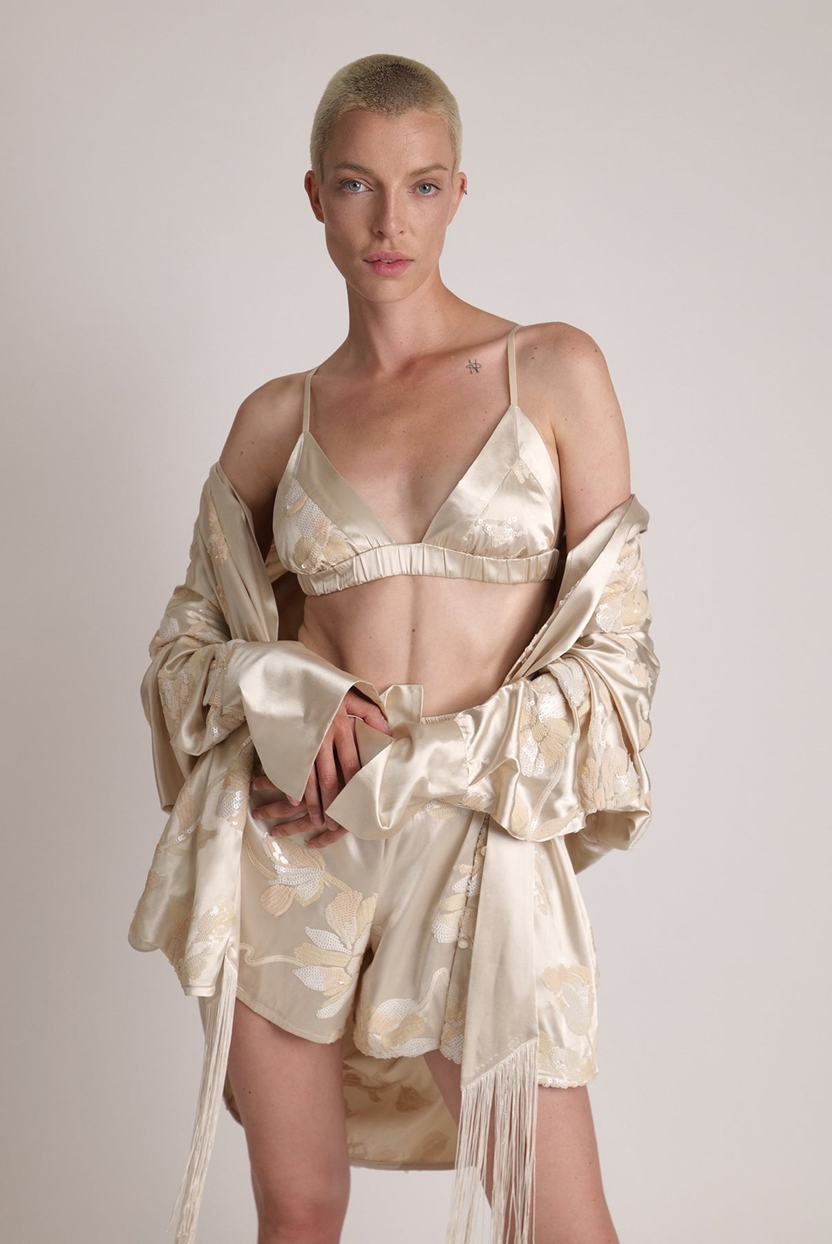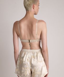 Blossom sequins on satin bra with front buckle fastening.