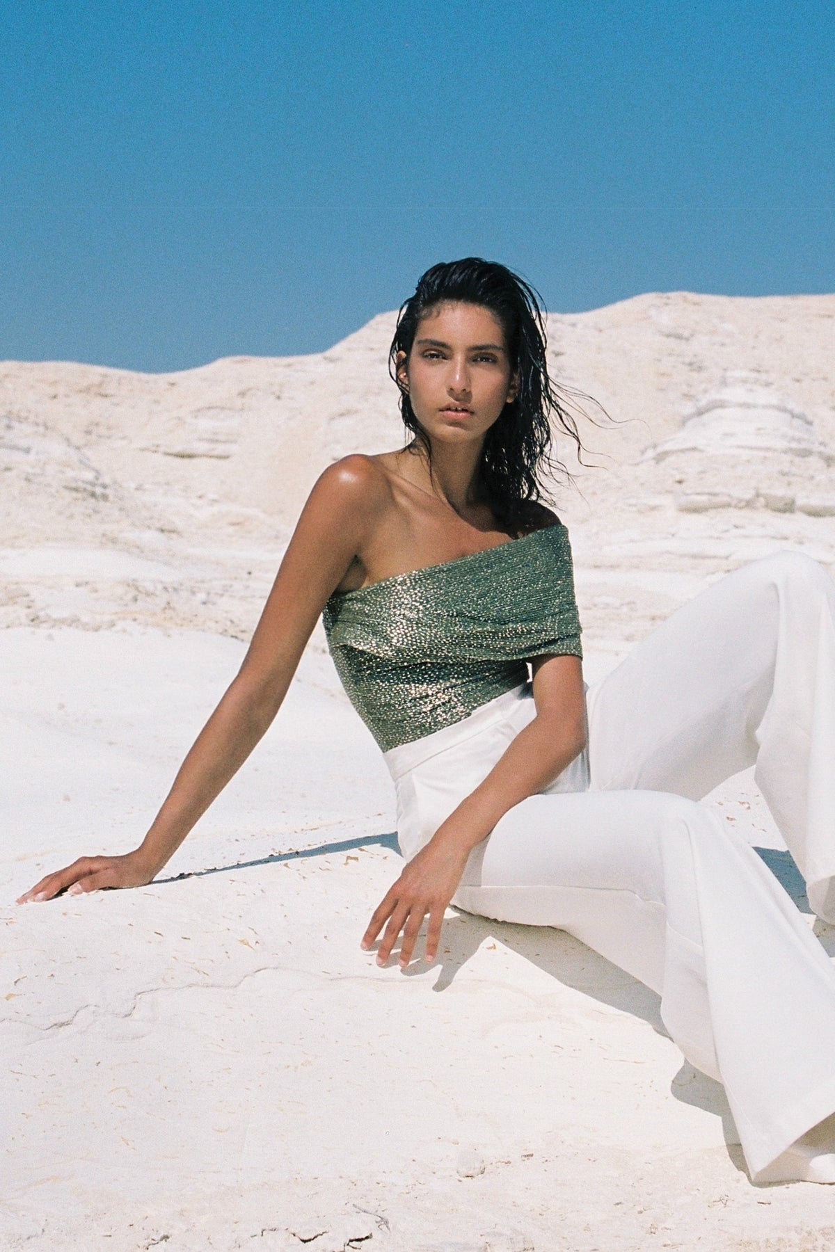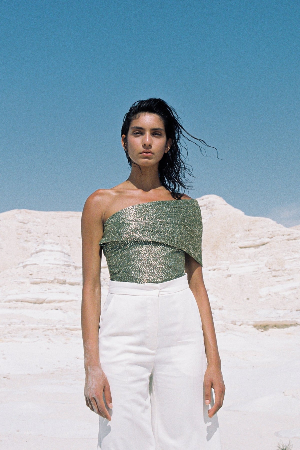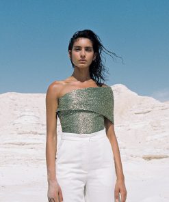 Pleated knit with speckled foil bodysuit with an asymmetric off-the-shoulder gathered detail, and invisible zipper at the back.