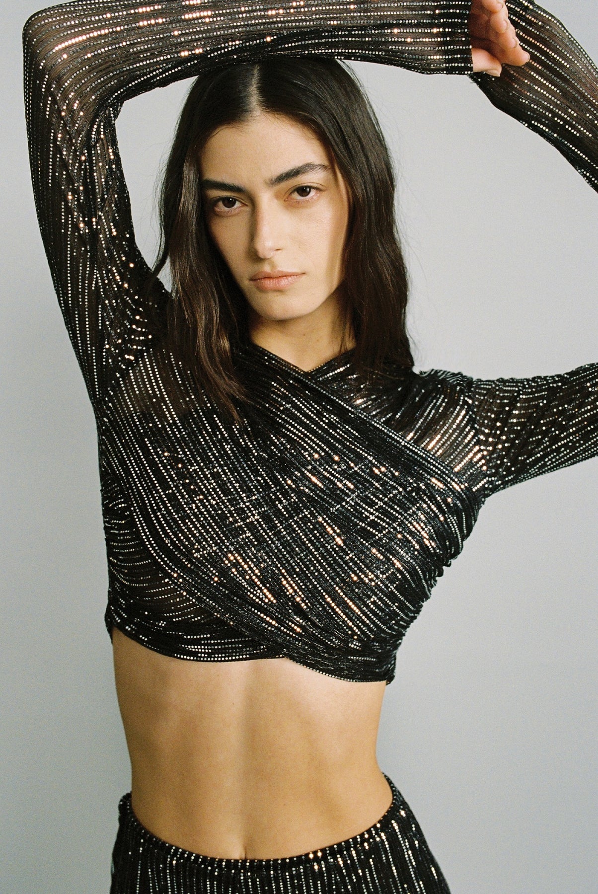 Ray lurex crop top with wrap gathered detail on the front, and long sleeves.