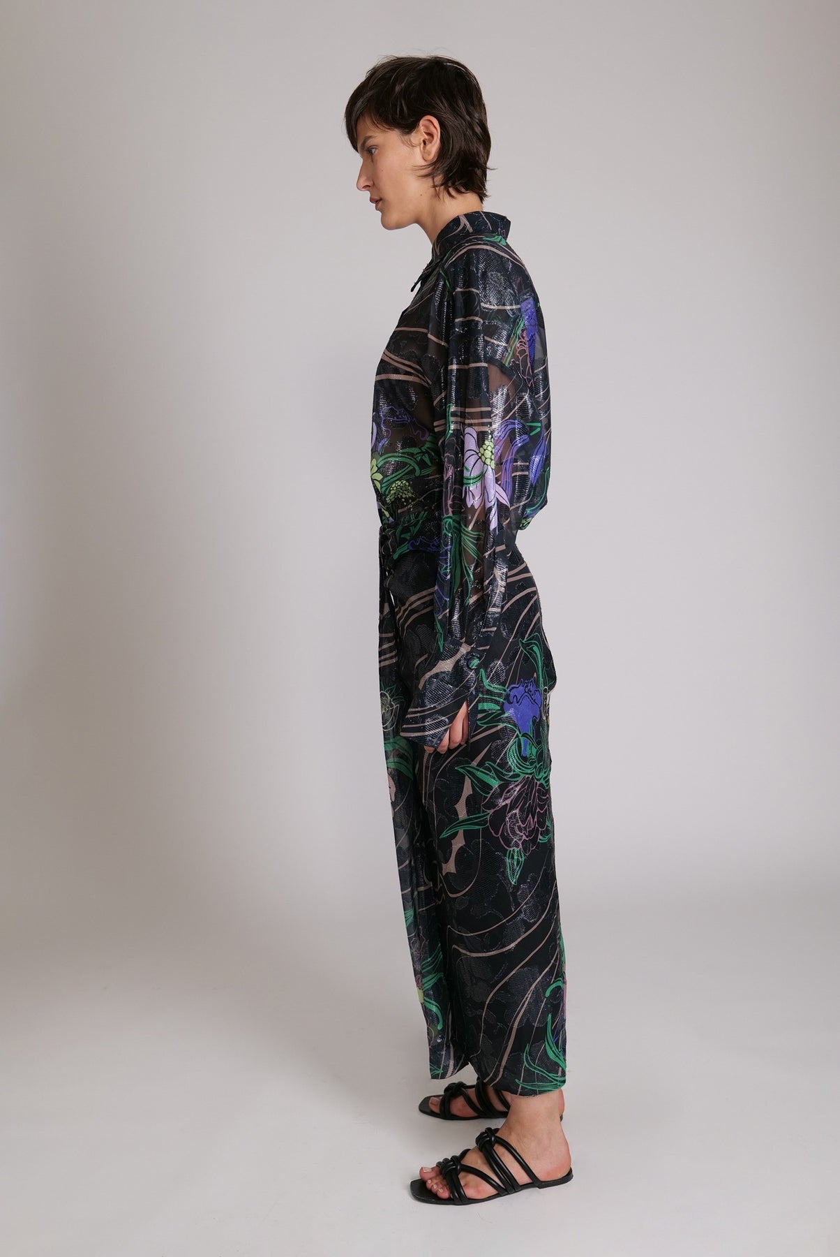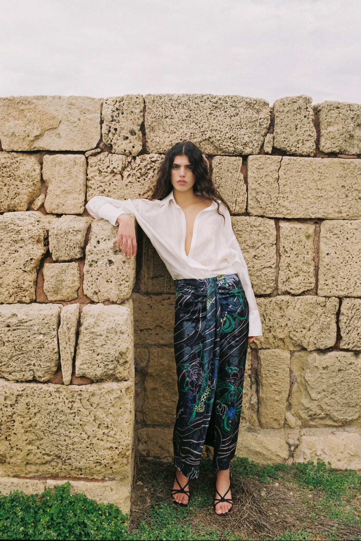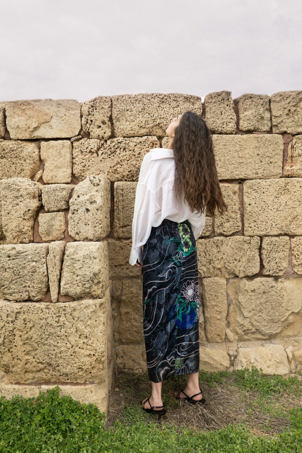 High-waist organza mid skirt featuring a front slit, invisible zipper and hook & eye at center back.