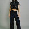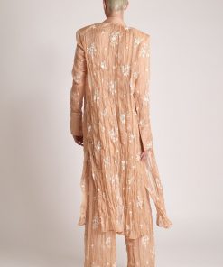 Pleated chiffon with embroidery top with a collar, long sleeves, and button closure.