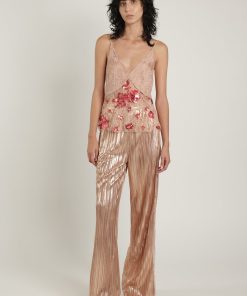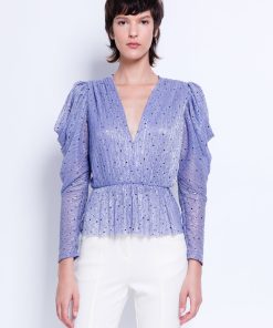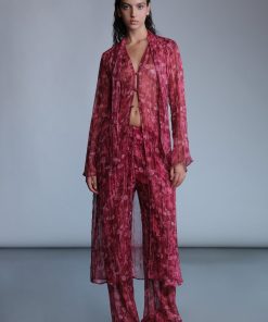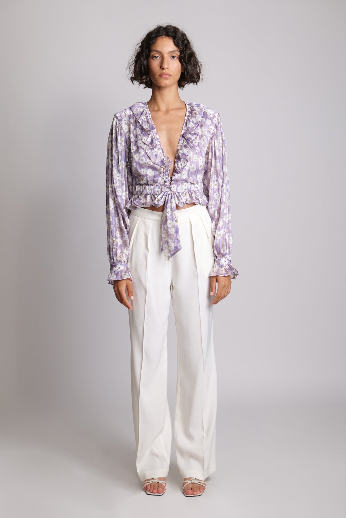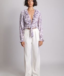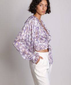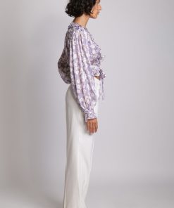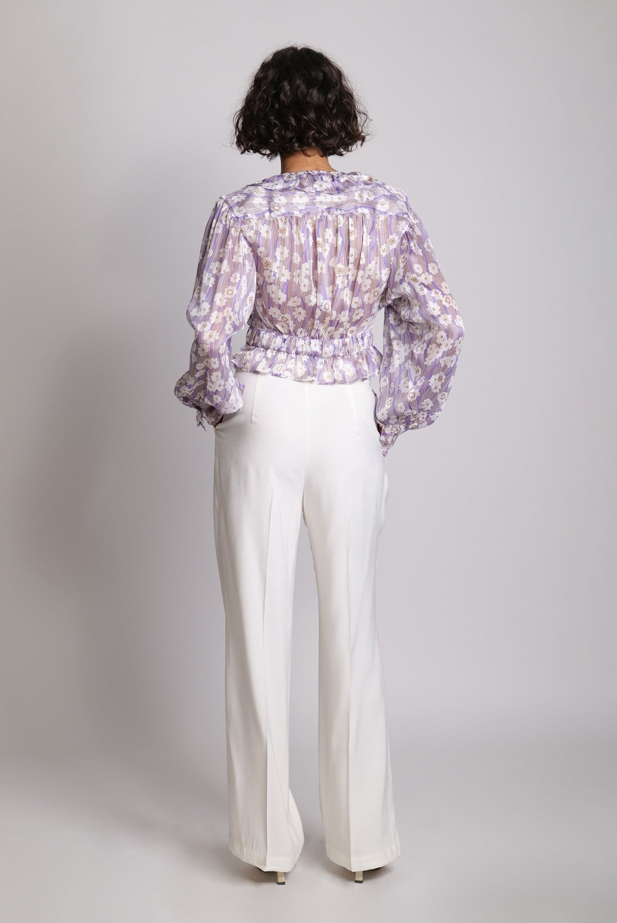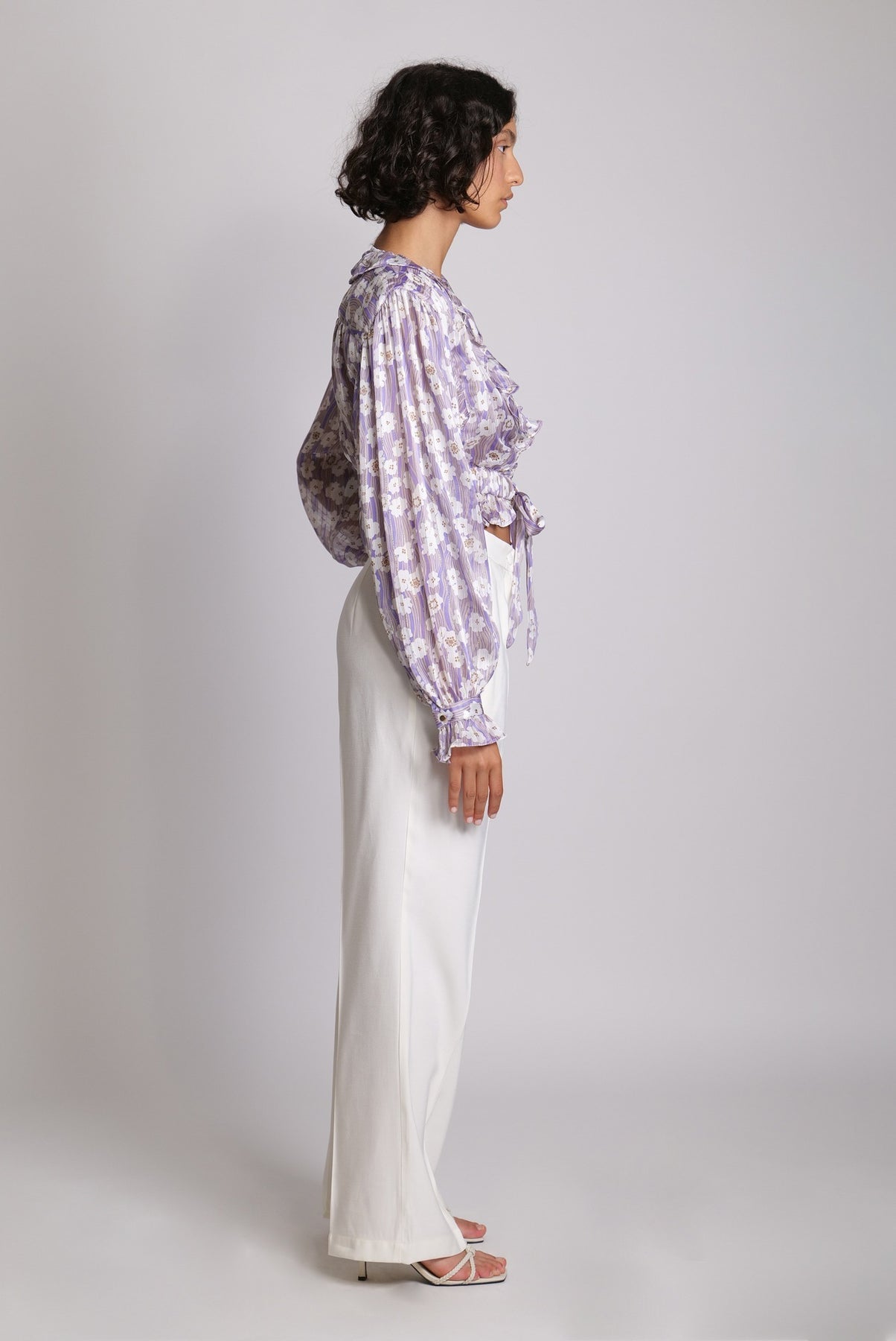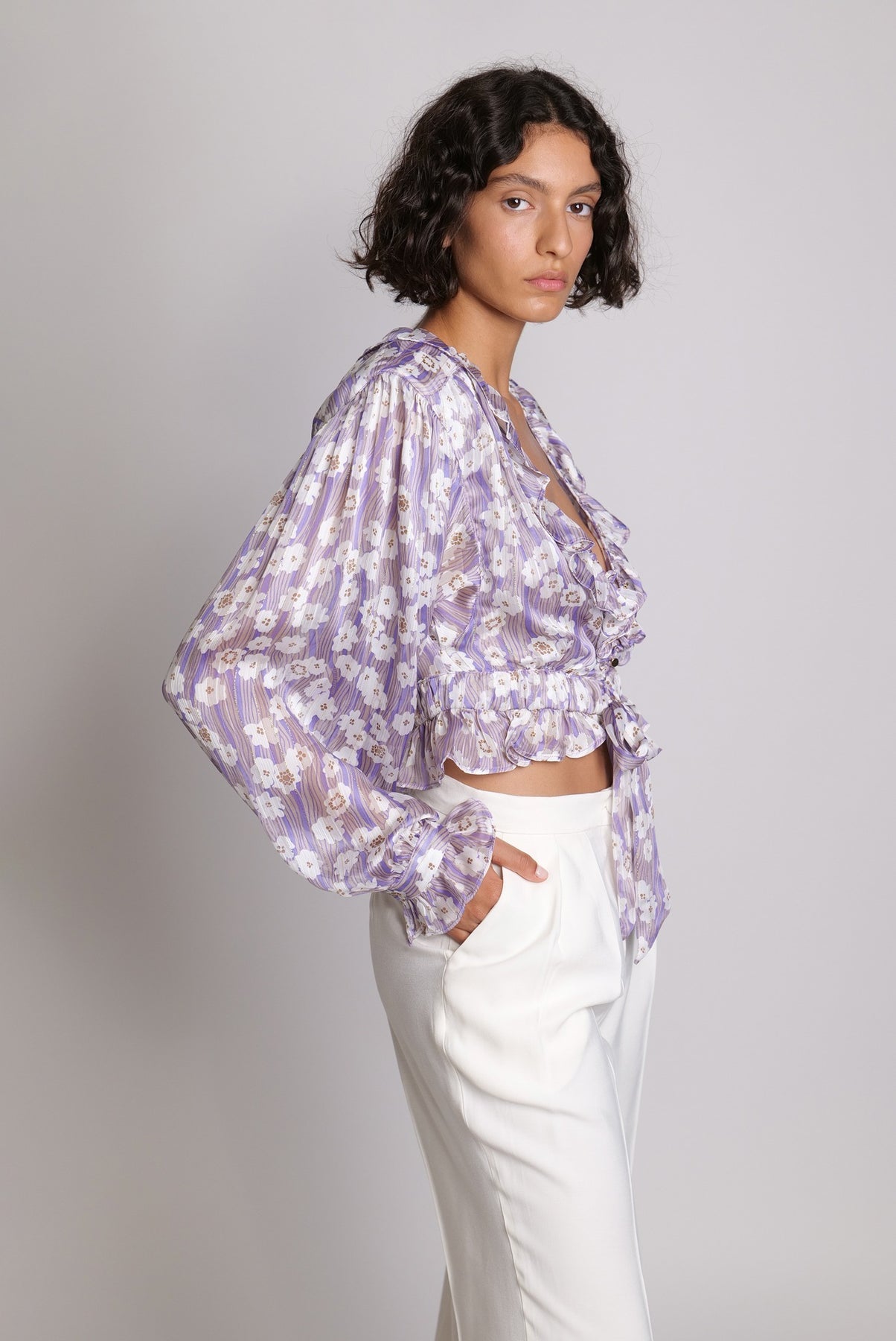 Printed chiffon blouse with a V-neckline and puffed long sleeves and ruffled cuffs. Ruffled hem, and front fastening with metallic buttons and belt tie.