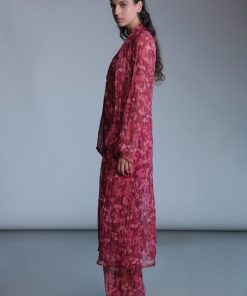 Printed chiffon blouse with a V-neckline and puffed long sleeves and ruffled cuffs. Ruffled hem, and front fastening with metallic buttons and belt tie.