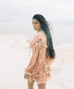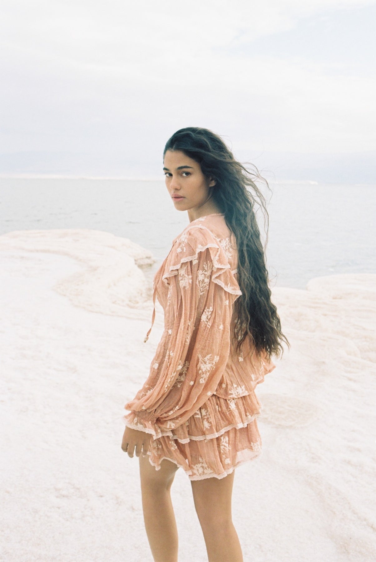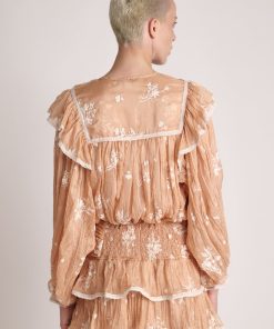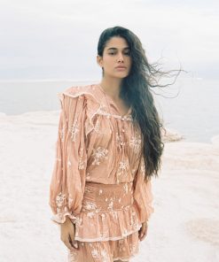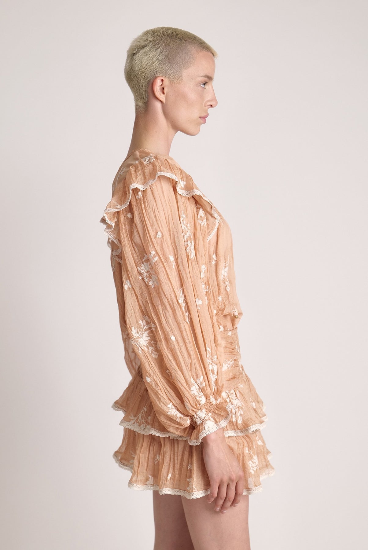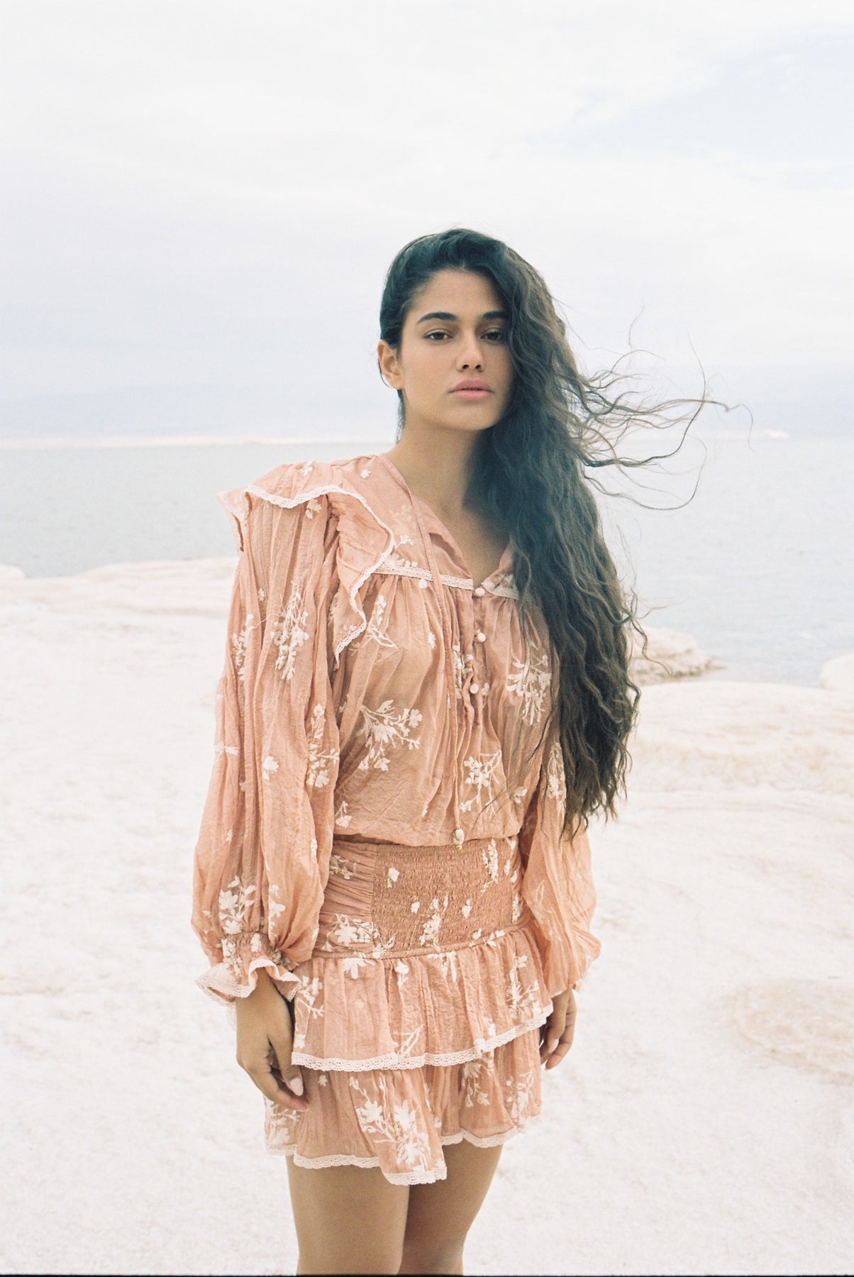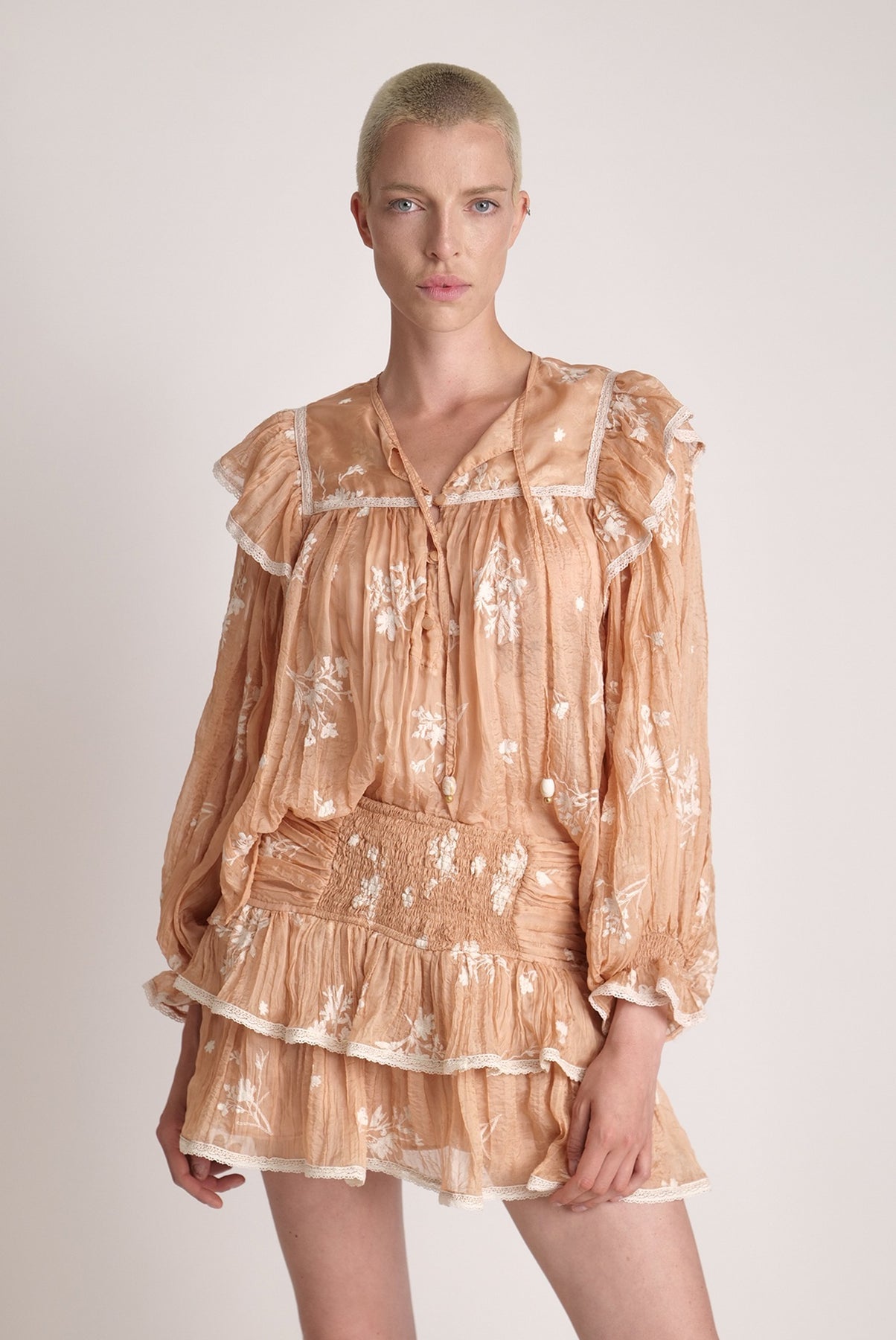 Pleated chiffon with embroidery Short high-waisted skirt with fitted waist and ruching at center front. Gathering details and invisible zipper at center back.