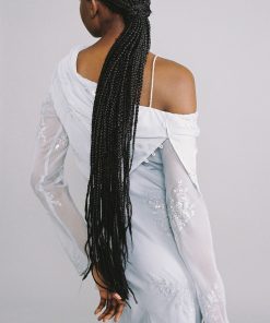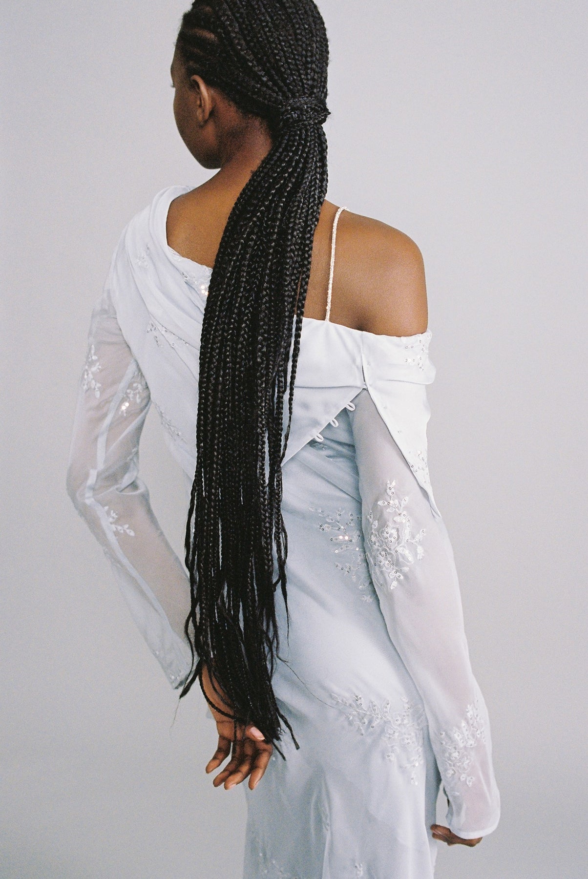 Embroidered chiffon maxi dress asymmetric off-the-shoulder, and long sleeves.