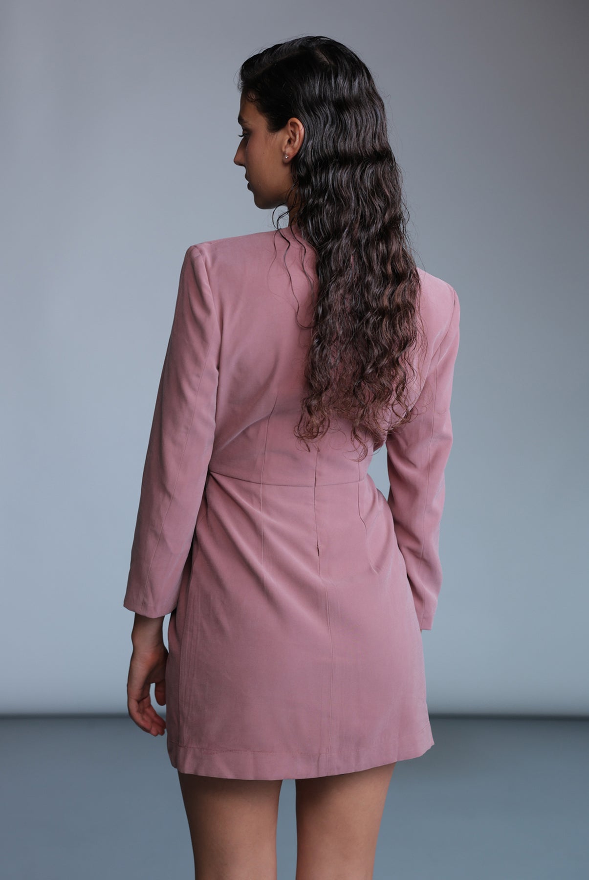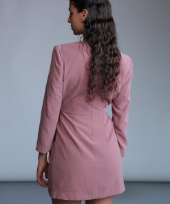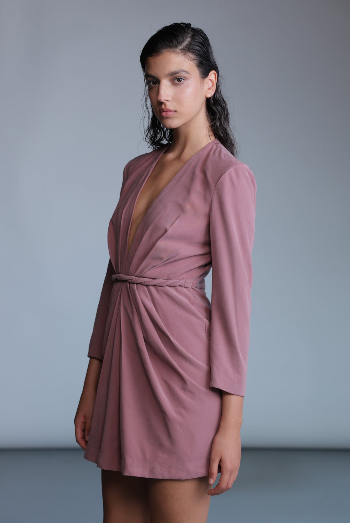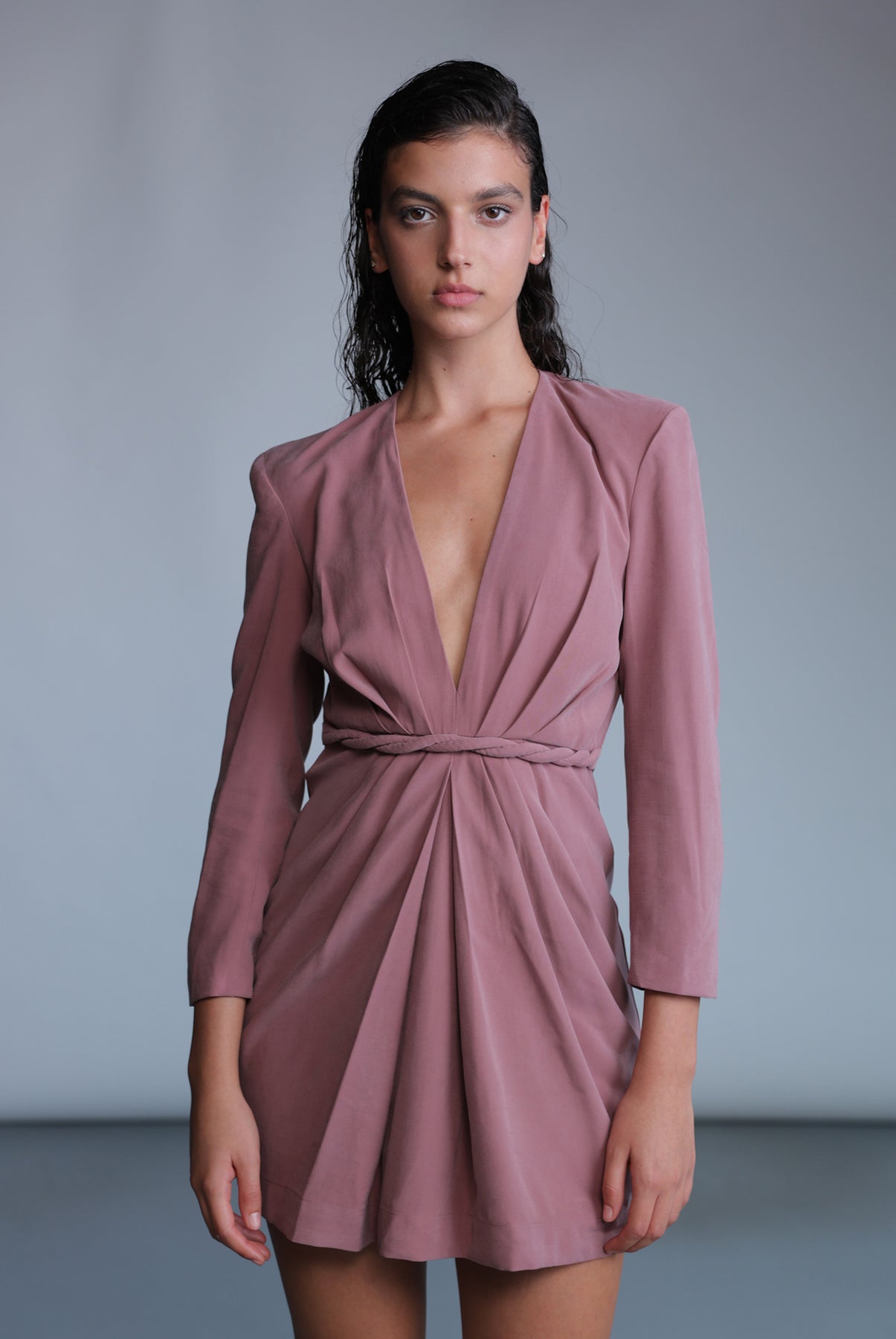 Diagonal viscose blend deep V-neckline mini dress, padded shoulders, gathering details at center front, and invisible zipper at the back.
