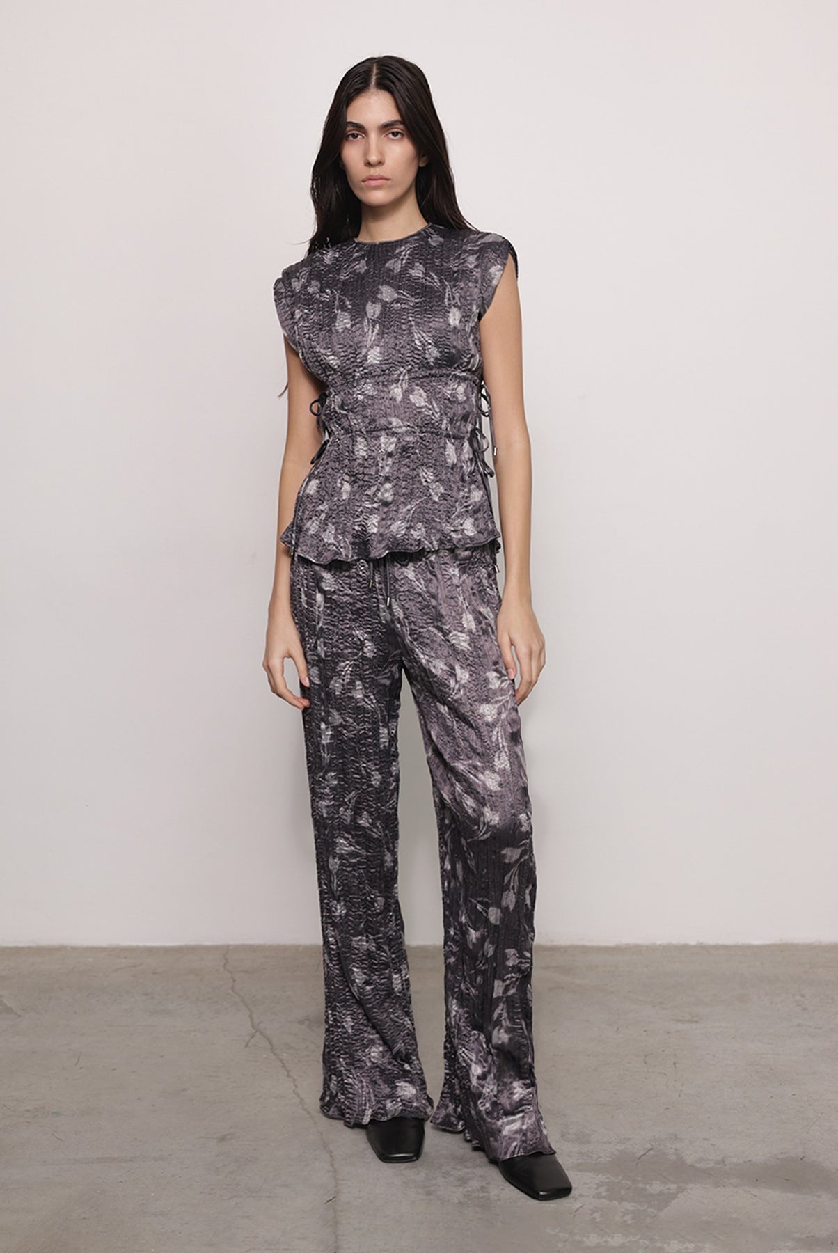 - Elastic waistband with drawstrings at the side.