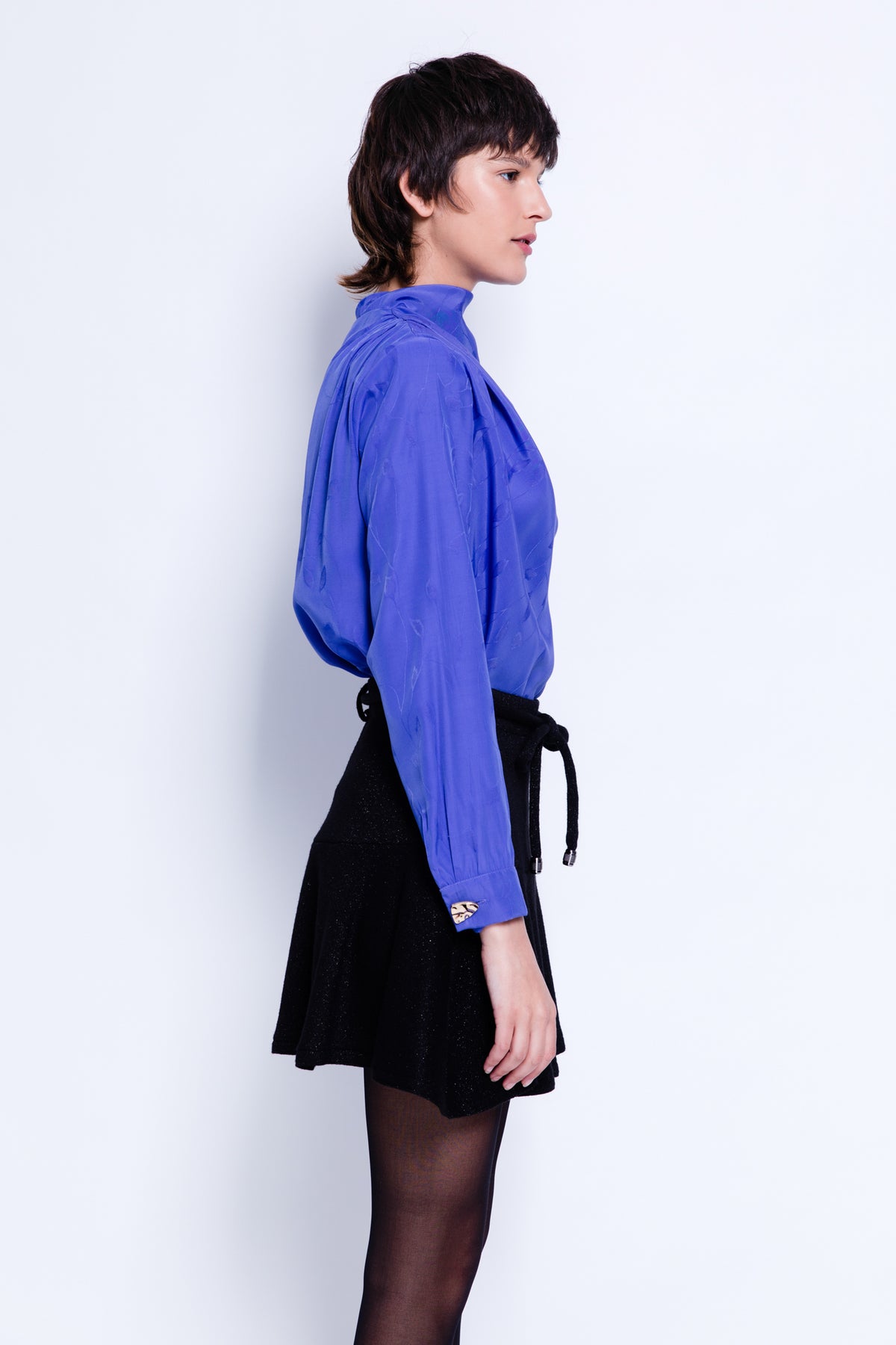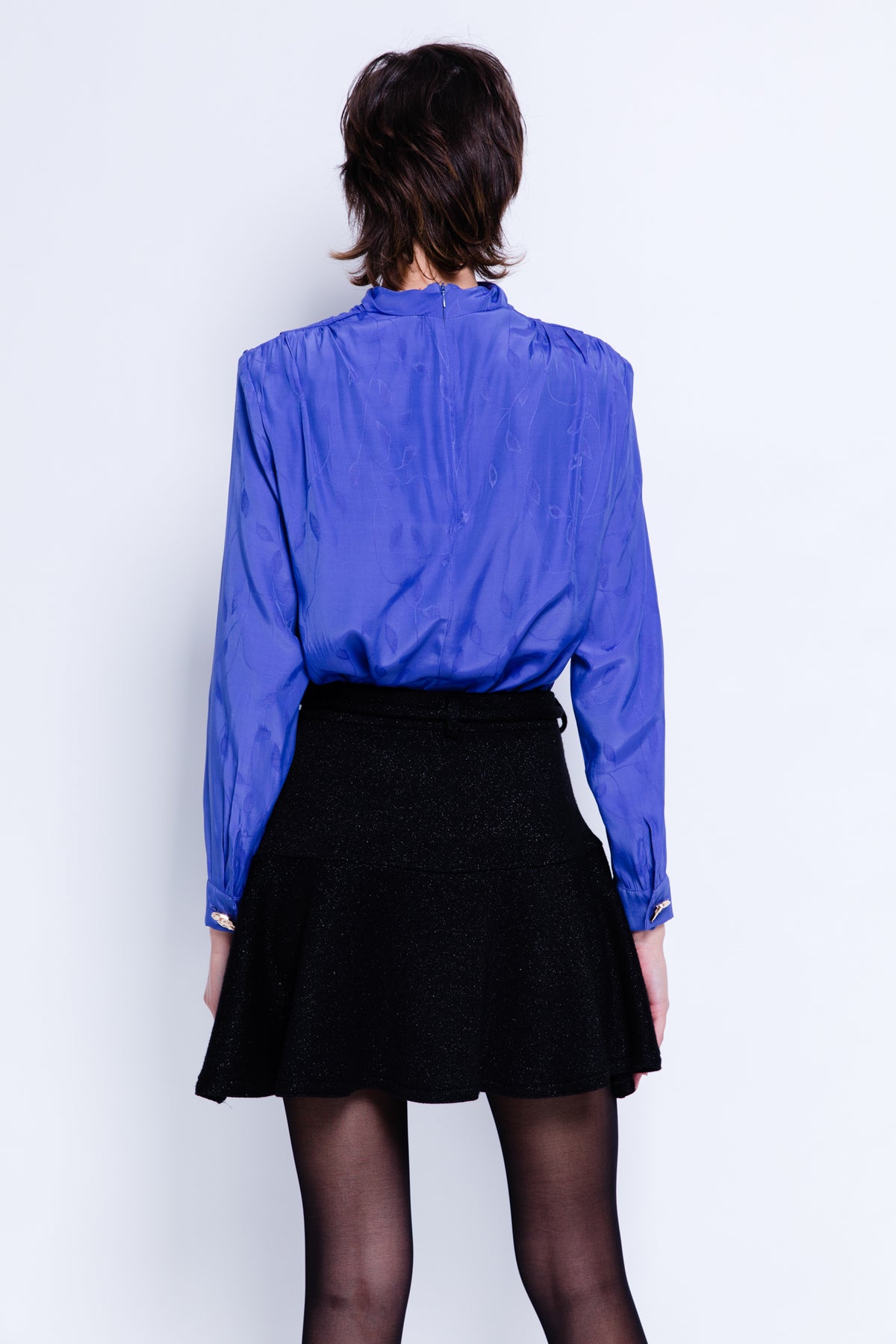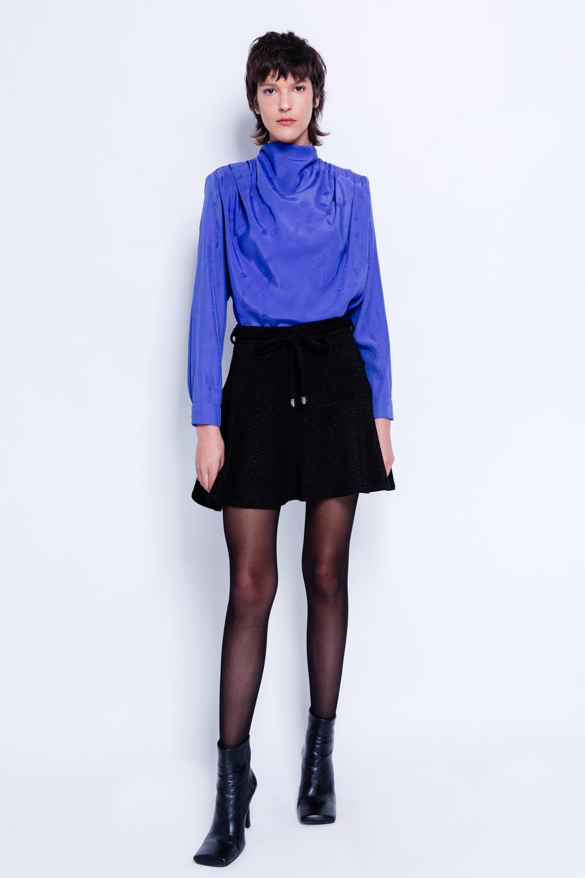 Lurex knit high waisted flared mini skirt with unique detachable belt with golden details.