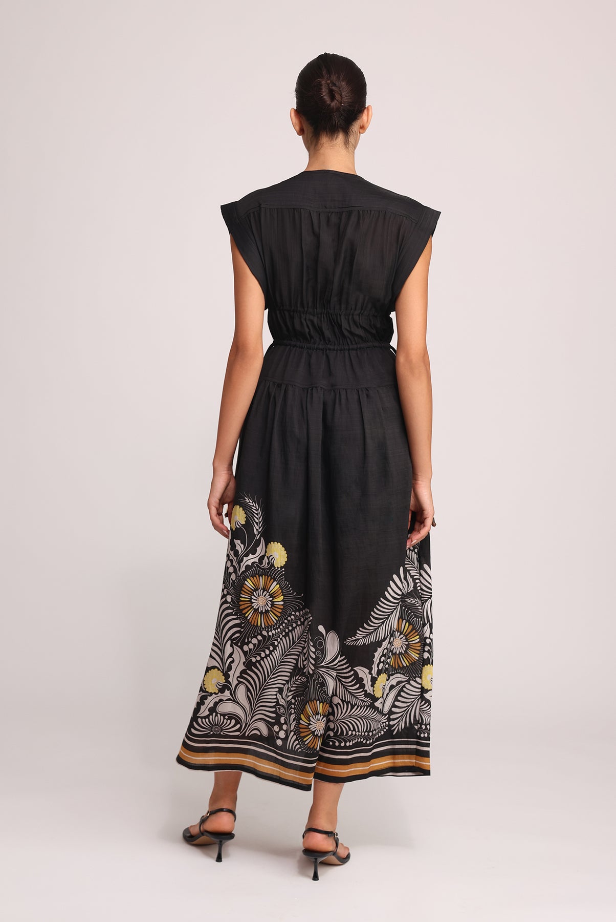 - Gathered detail at the shoulders and waist.