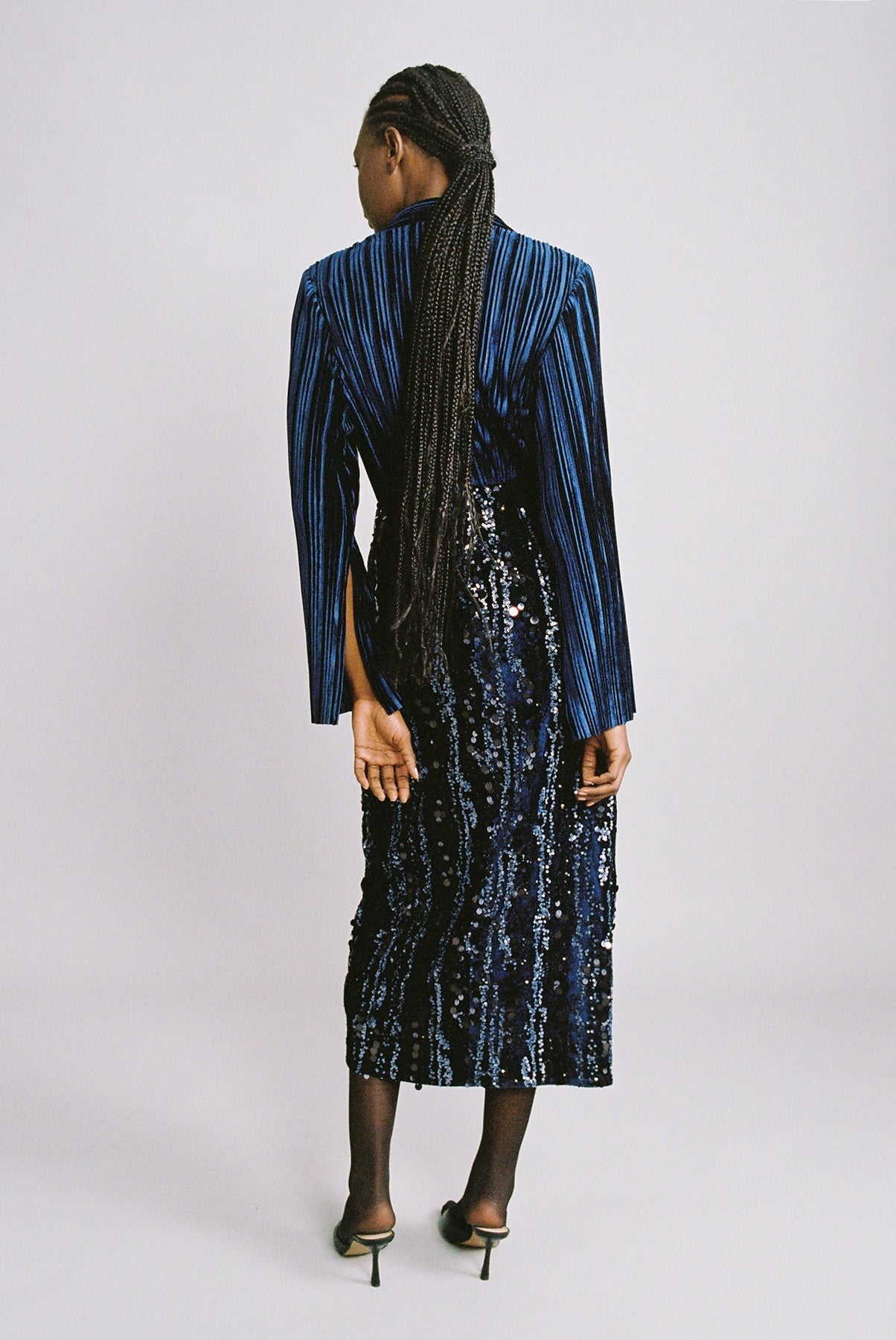 Stripe sequins on velvet pencil skirt with gathering details, front slit, and invisible zipper at the back.