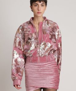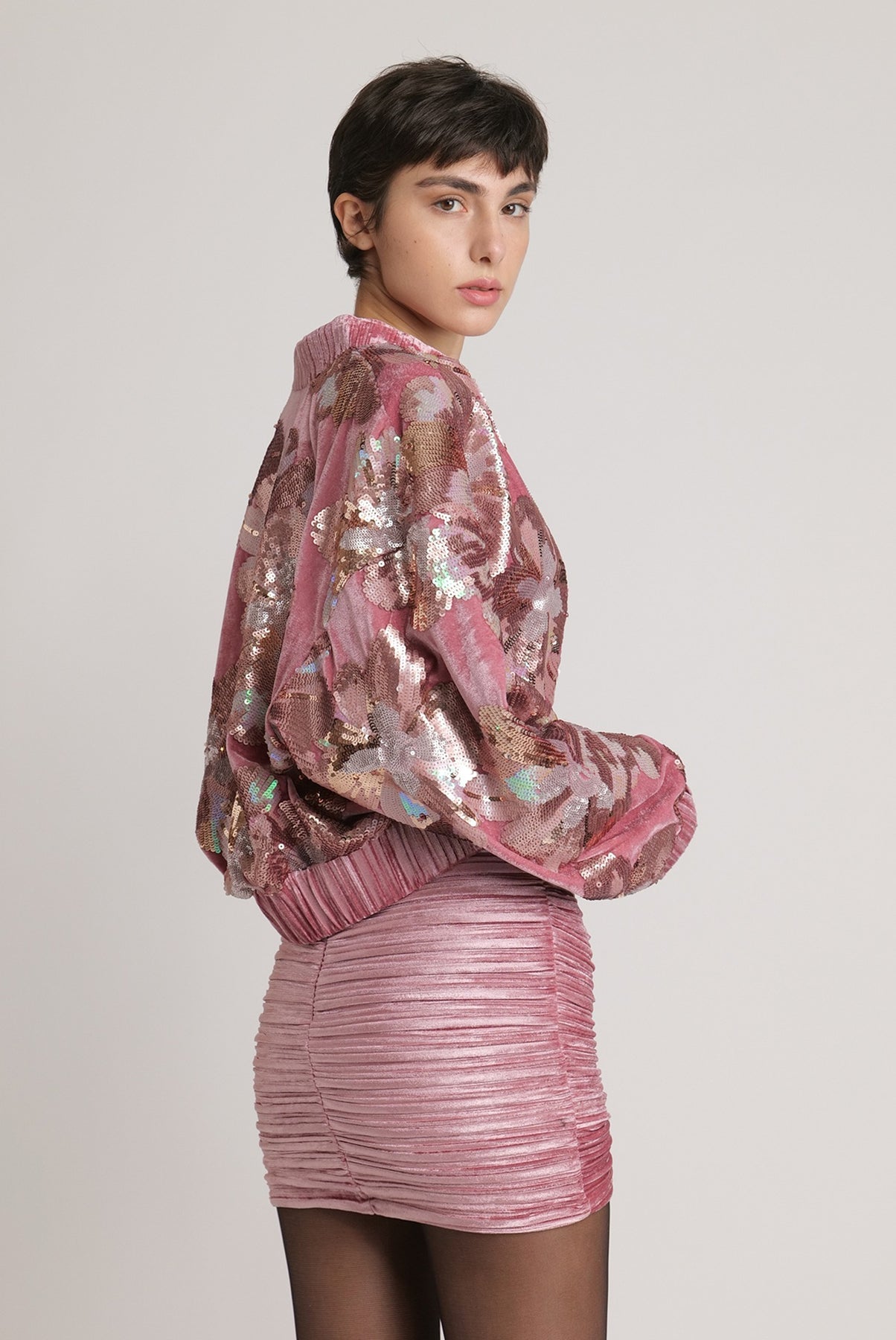 Pleated velvet fitted high waisted mini skirt with gathering details.