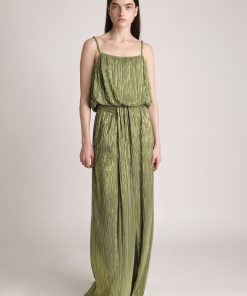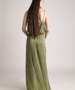 Pleated knit with foil gathering and high-waist skirt with draped fabric detail, front slit, and elastic waist at back with invisible back zipper fastening.