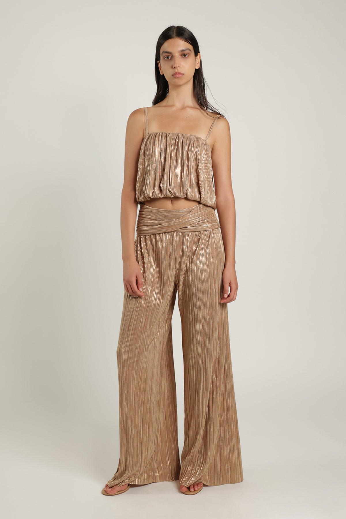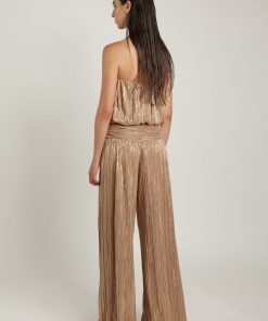 Pleated knit with foil long pants featuring a unique twist gathering detail on the waistline, and invisible back zipper fastening.