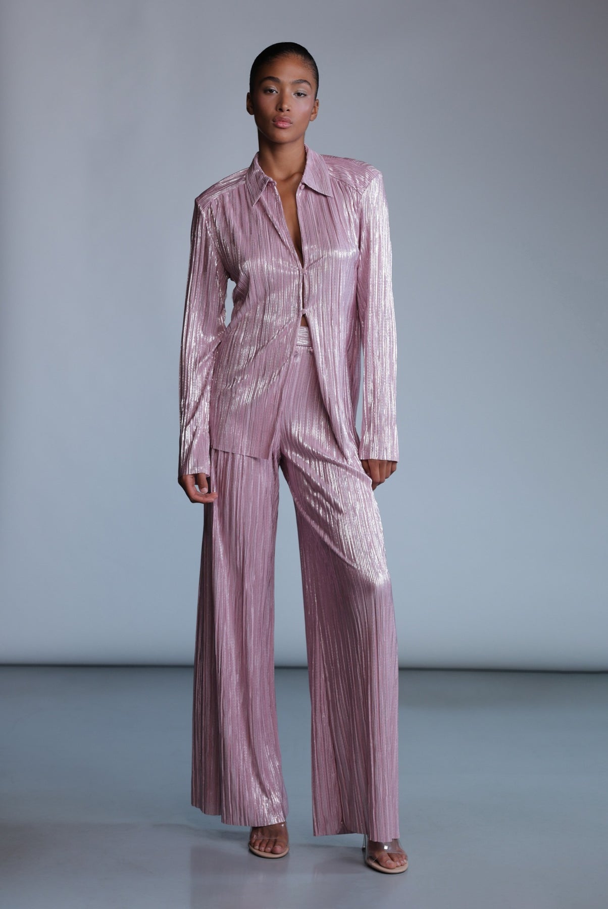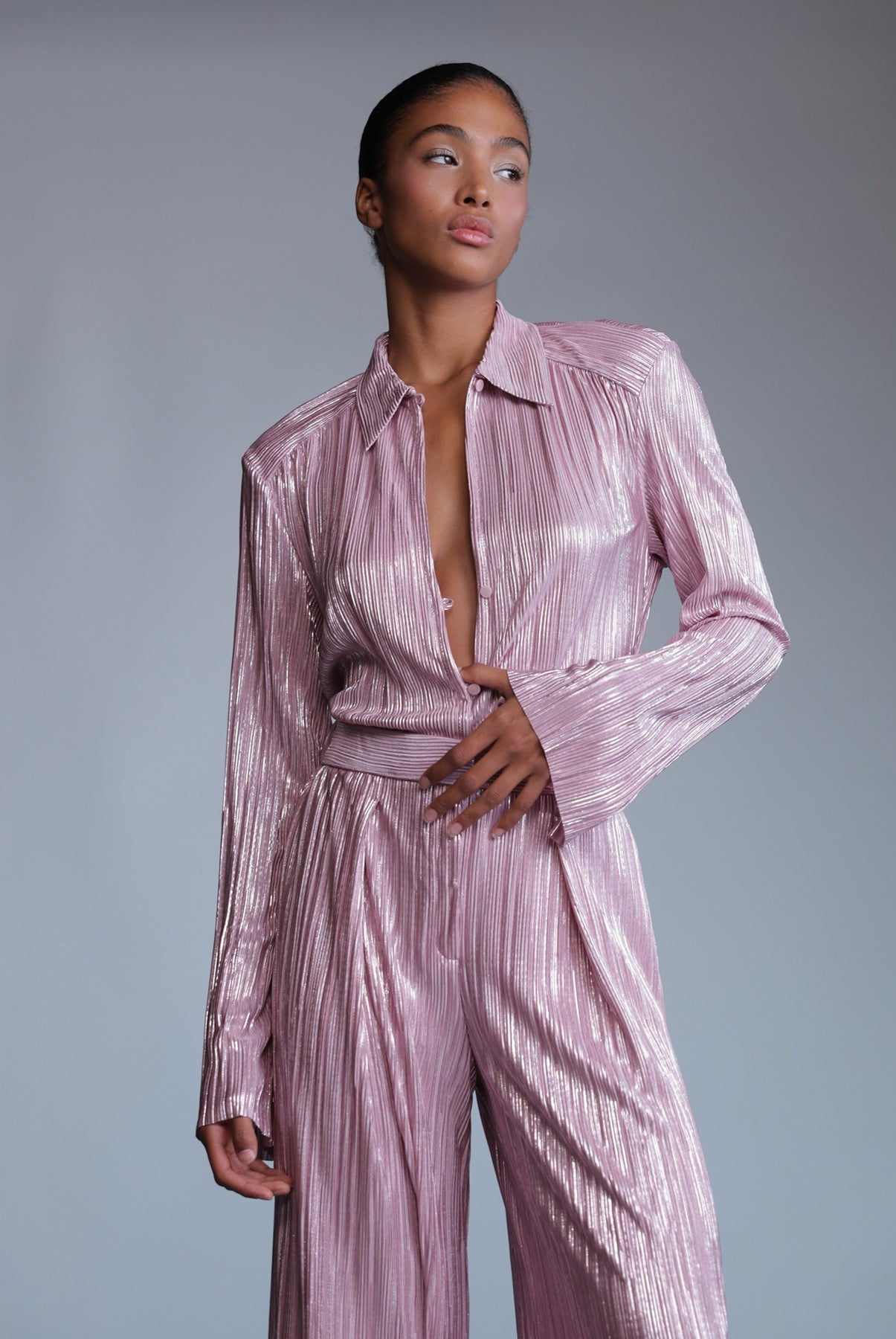 Pleated knit with foil top with a collar and long sleeves, and button closure at center front.