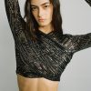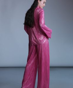 Pleated knit with foil top with a collar and long sleeves, and button closure at center front.