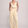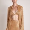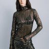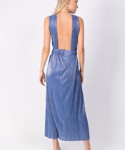 Pleated knit with foil high waisted midi skirt with draped front detail and slit.