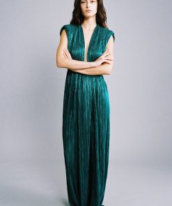Pleated knit with foil sleeveless maxi wrap dress featuring a deep V-neckline, shoulder pads, and front slit. Draped fabric detail at front.