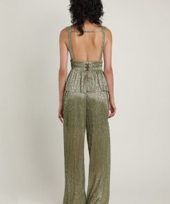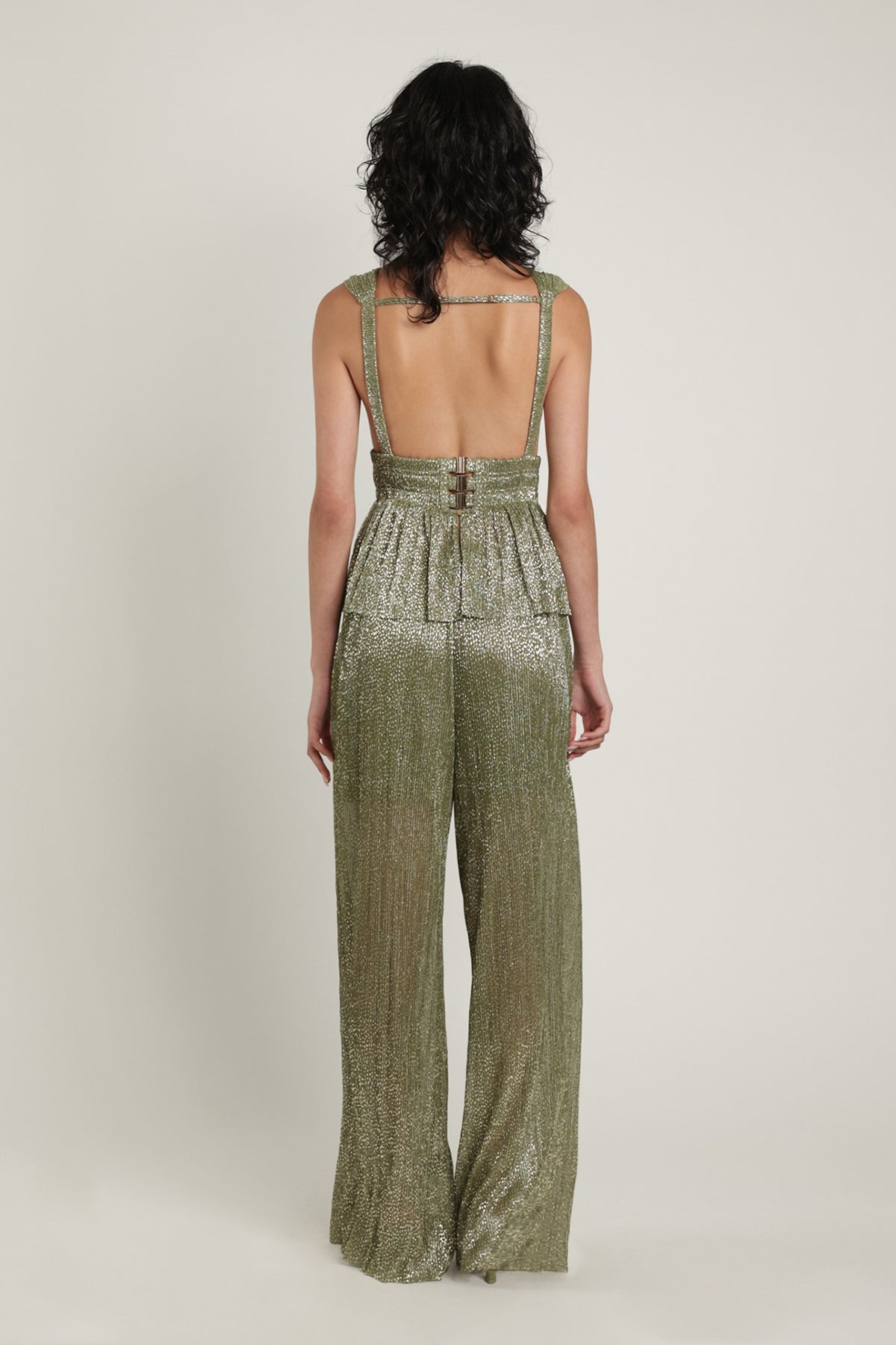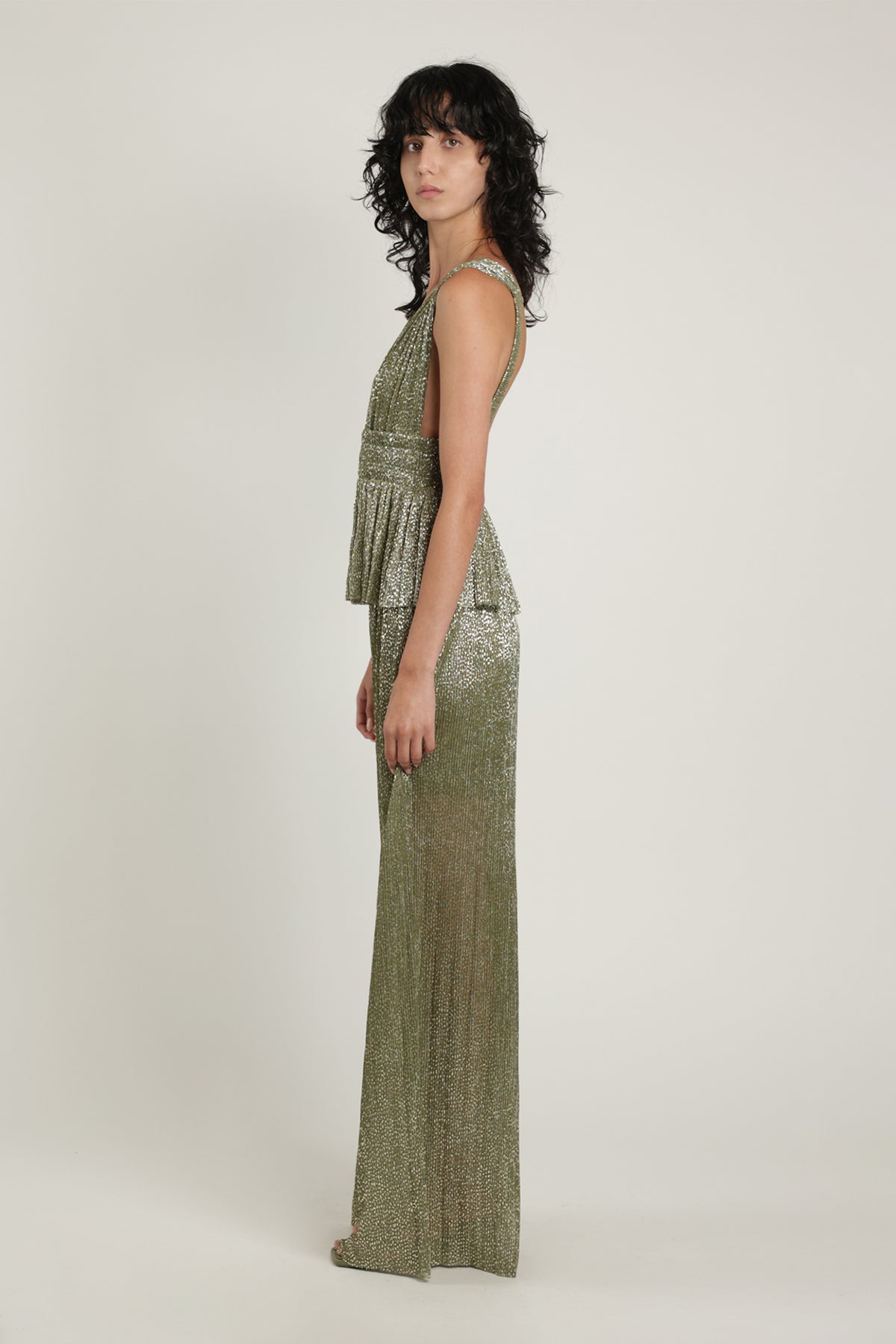 Pleated knit with speckled foil high-waist straight leg pants, and elastic waistband.