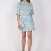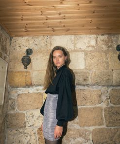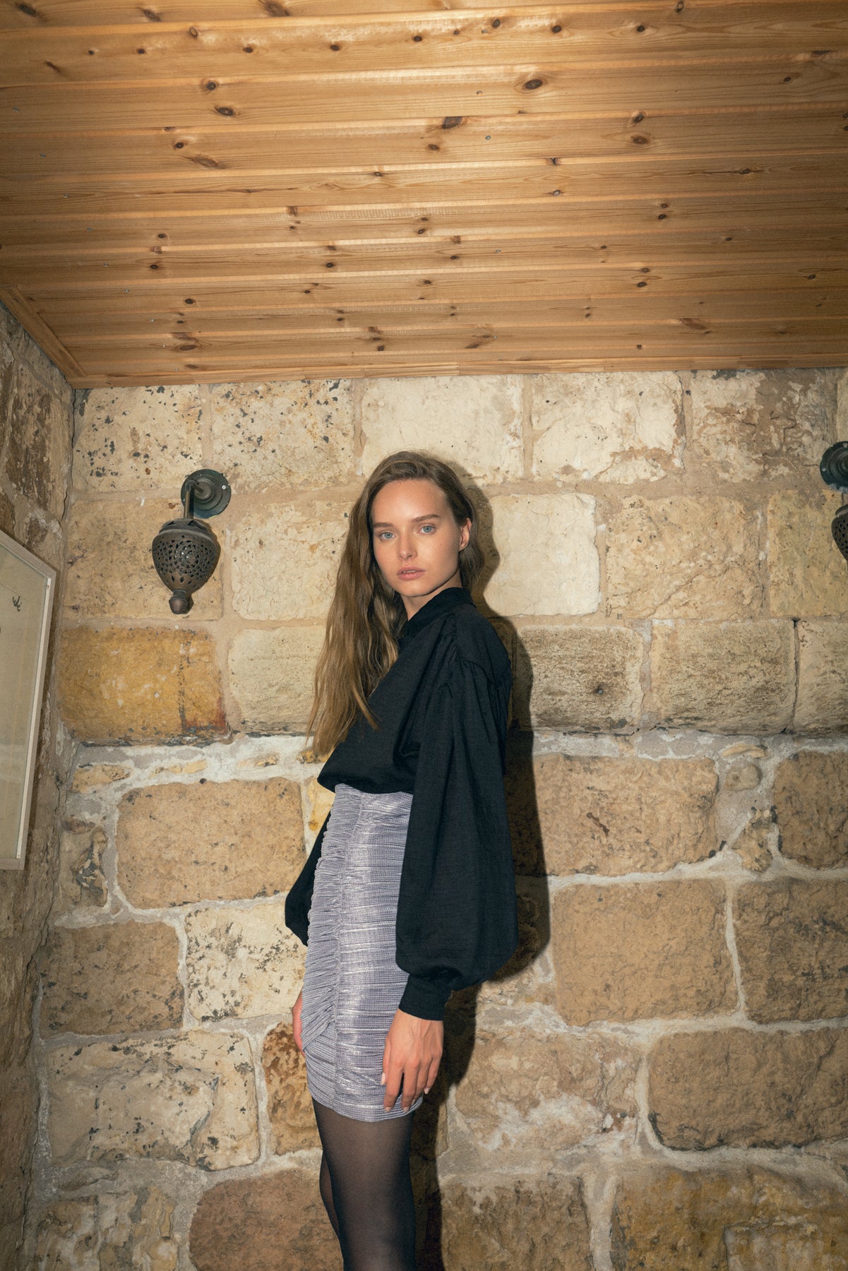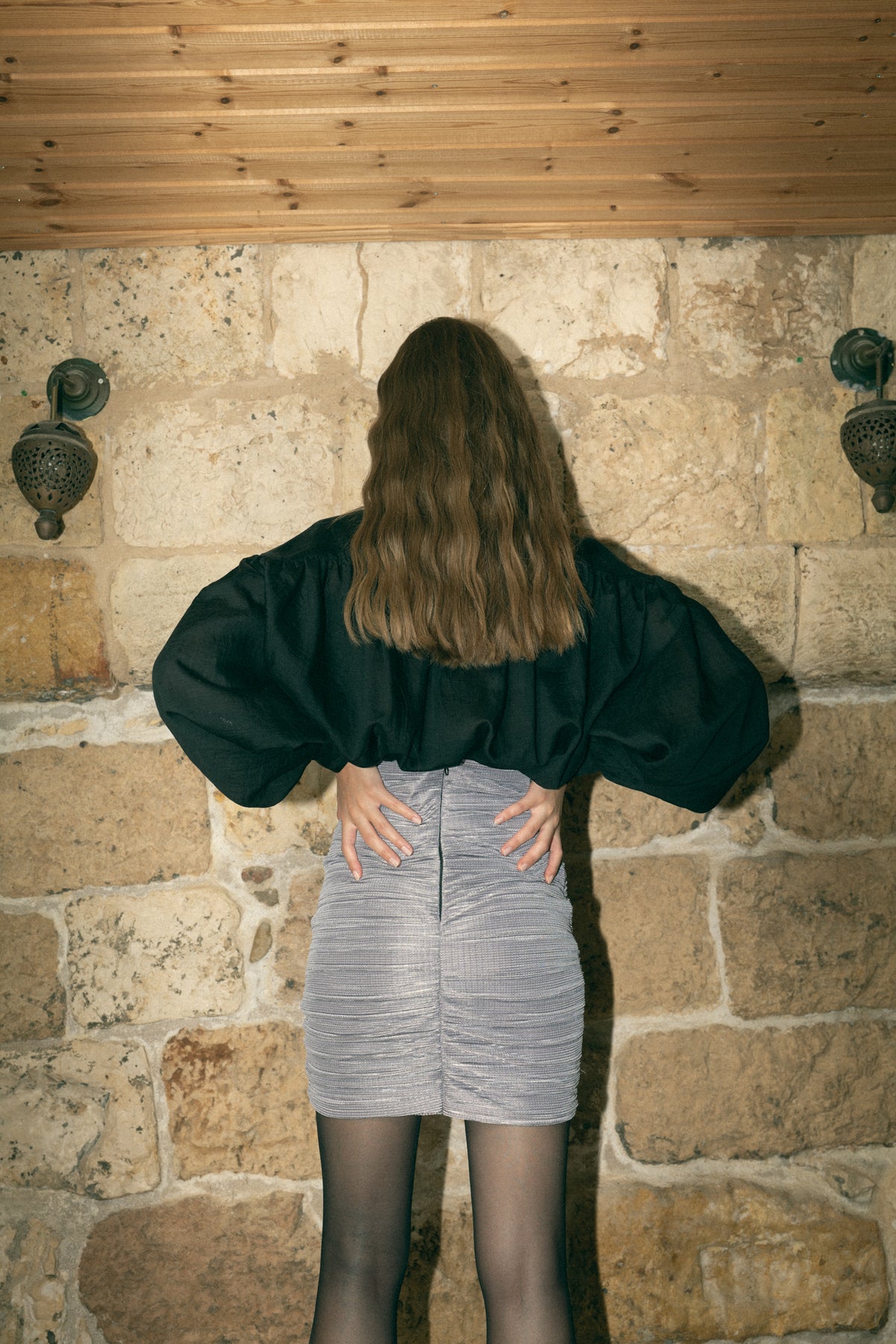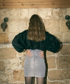 Pleated knit high-waisted fitted mini skirt withgathering at sides, crossed hem, and invisible zipper atcenter back.