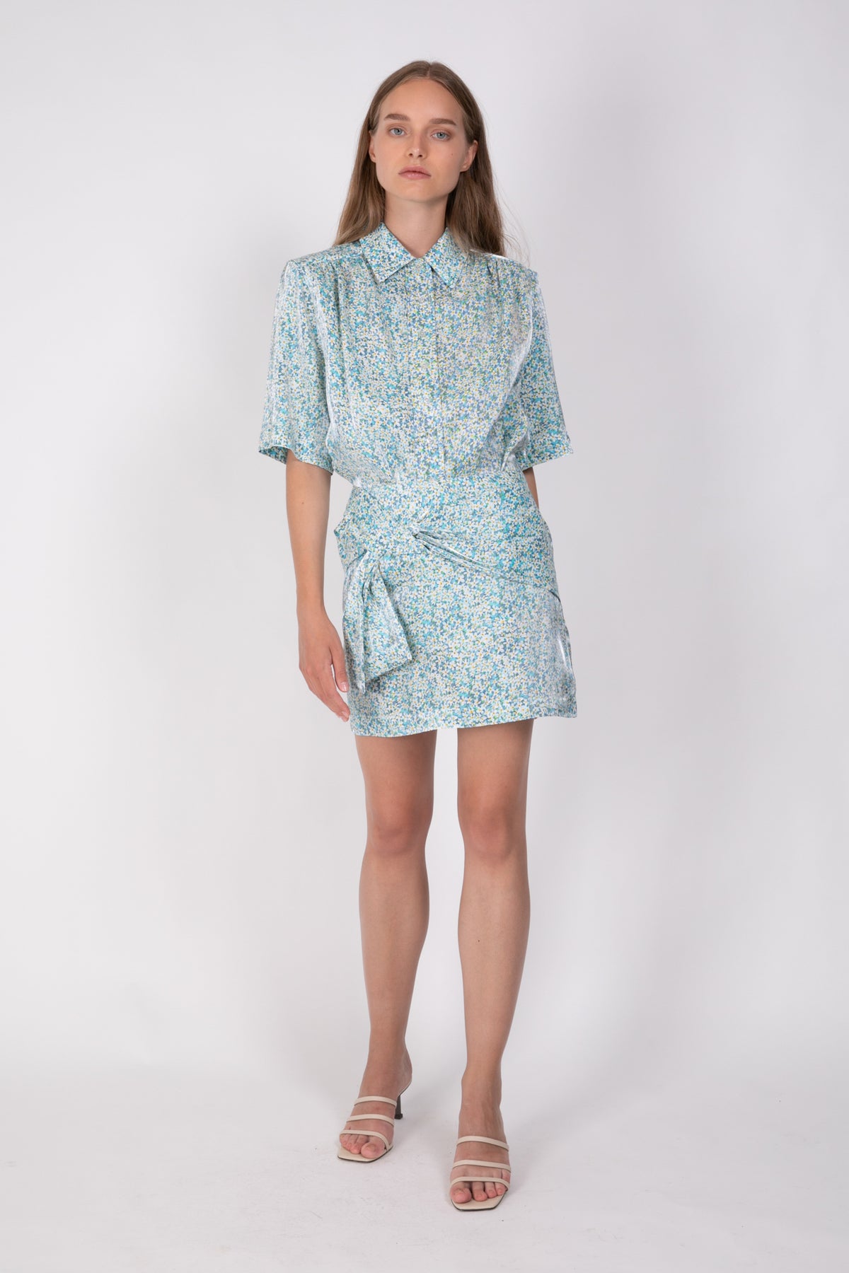 Shiny printed viscose high waisted fitted mini skirt with front tie detail.